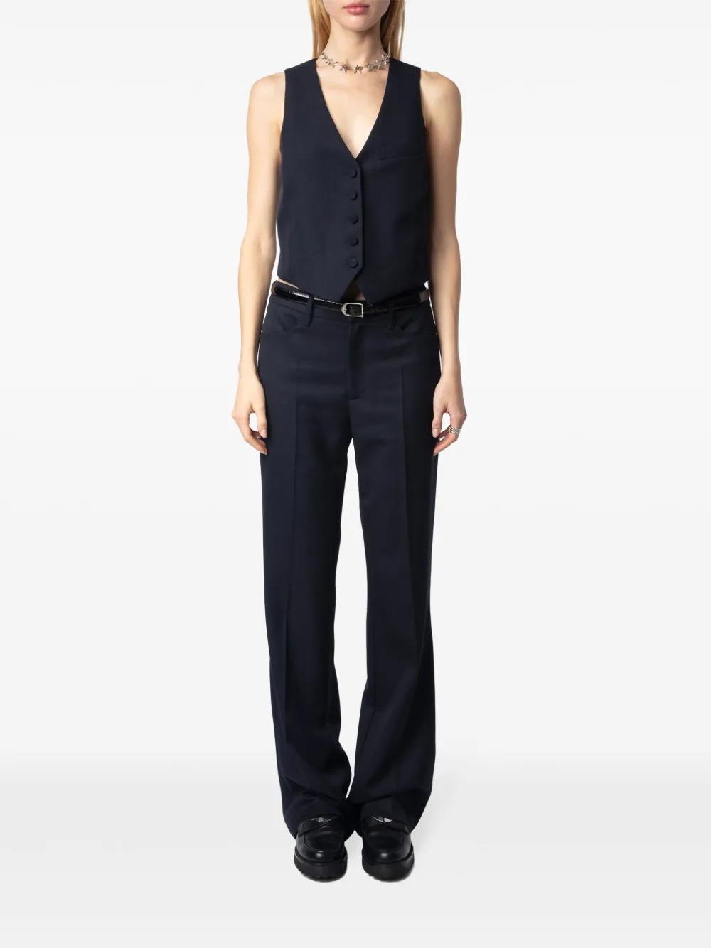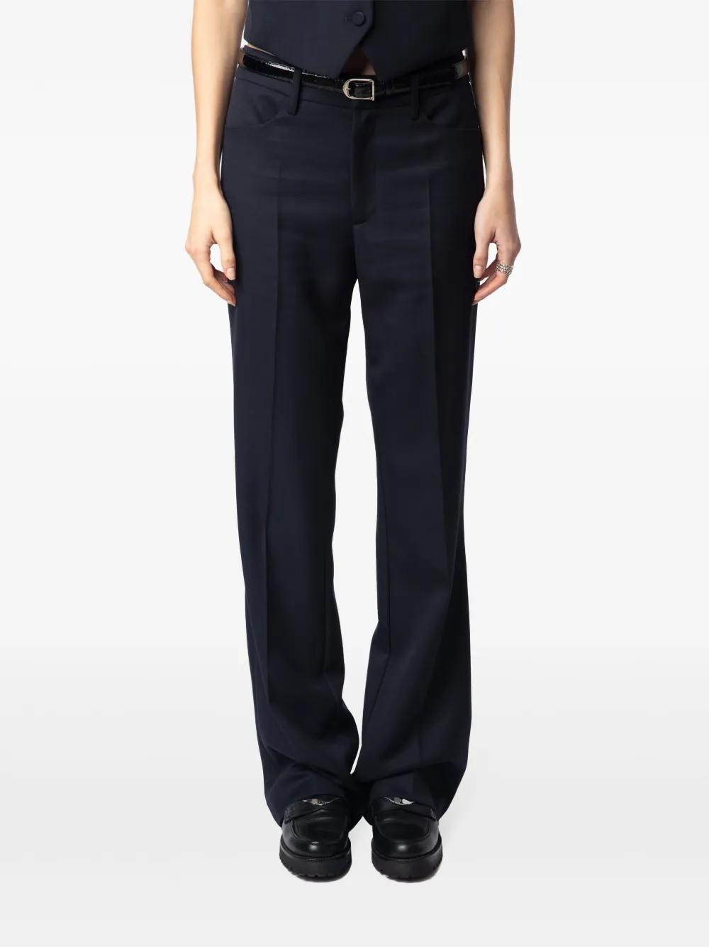 navy blue concealed fly and button fastening belt loops two side inset pockets two rear jetted pockets