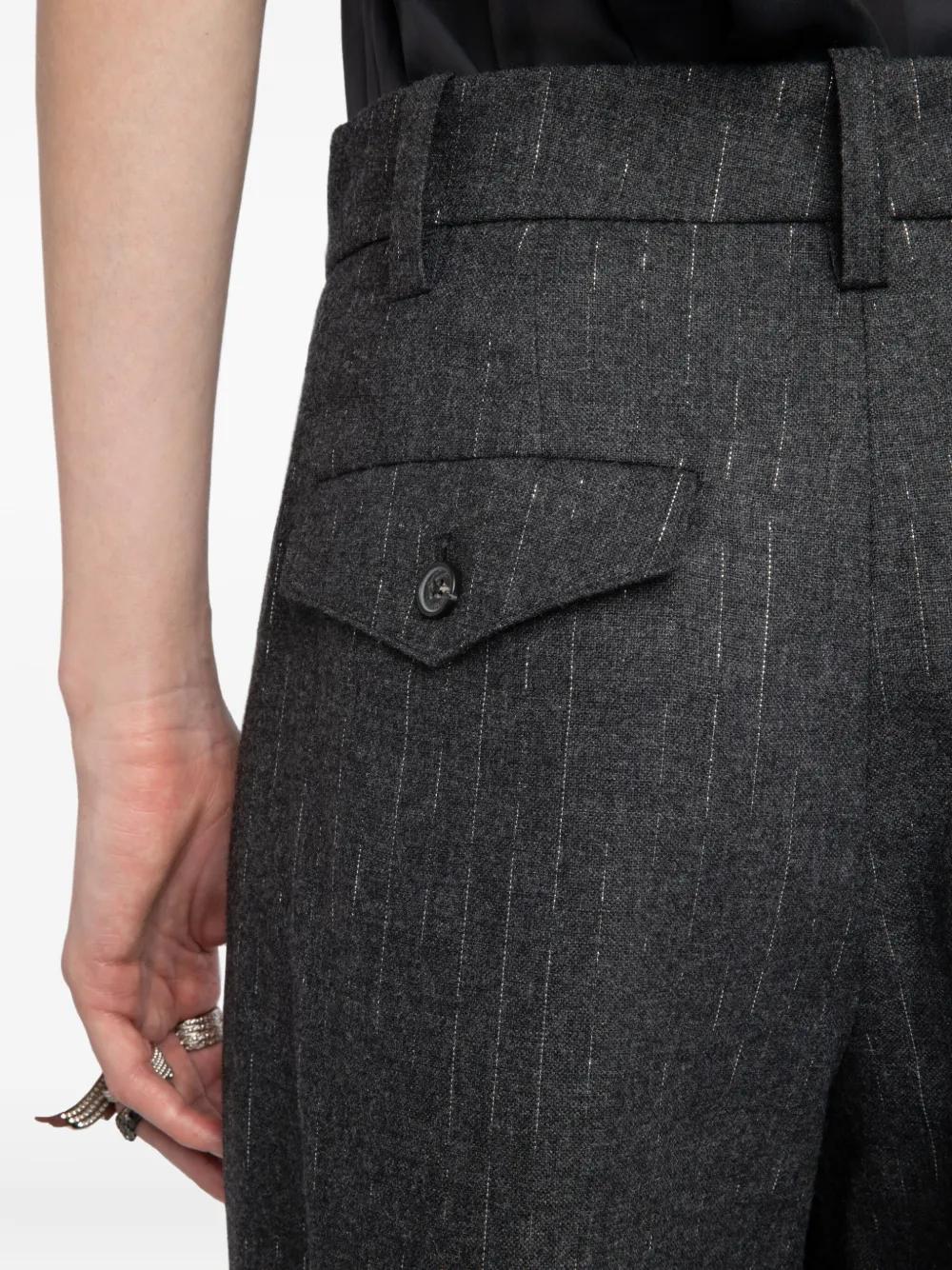 charcoal grey pinstripe pattern pleated front button fly welt pockets