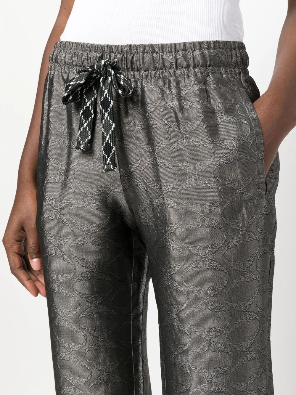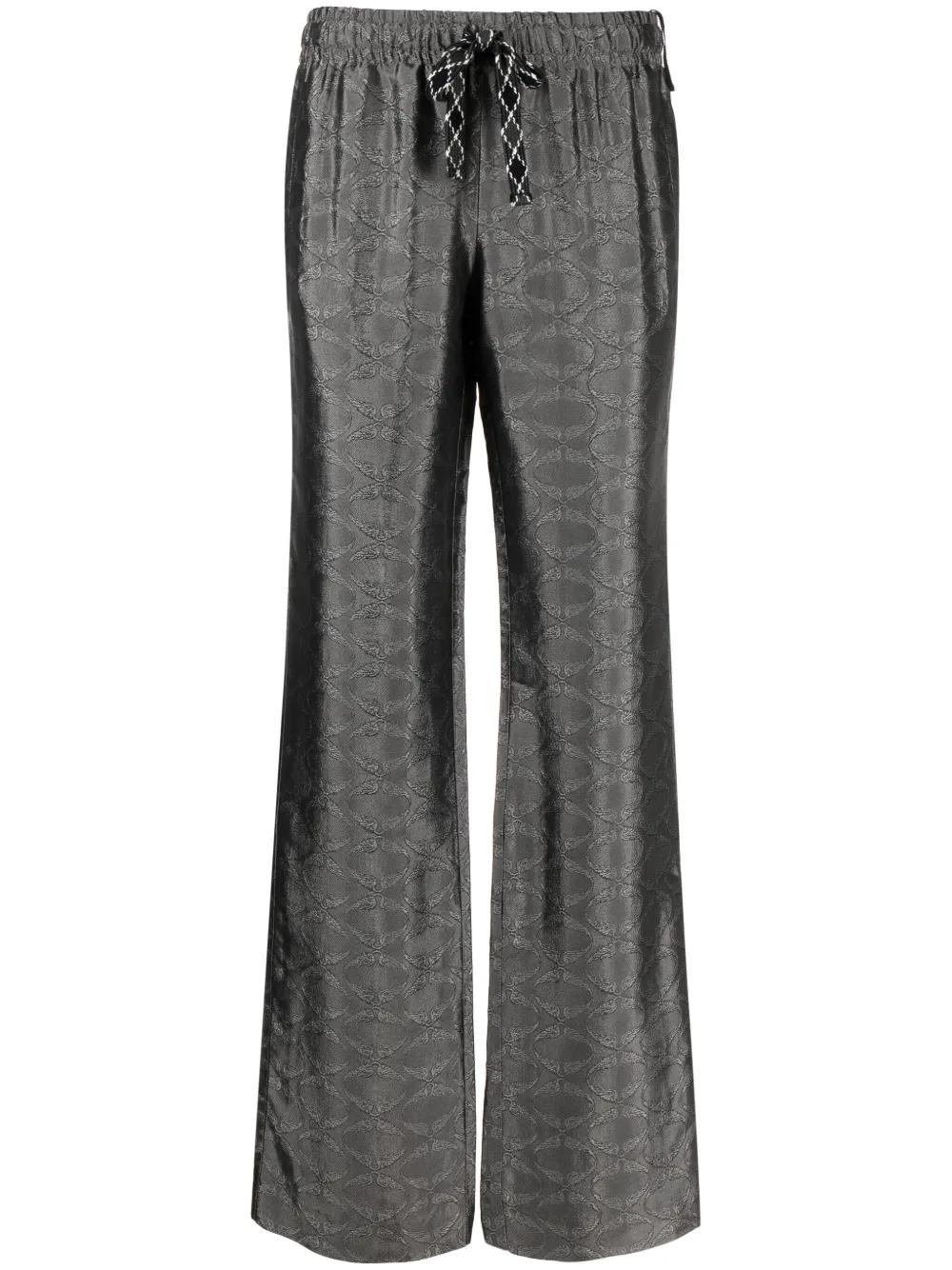 anthracite grey satin finish patterned jacquard elasticated drawstring waistband two side inset pockets flared ankle-length