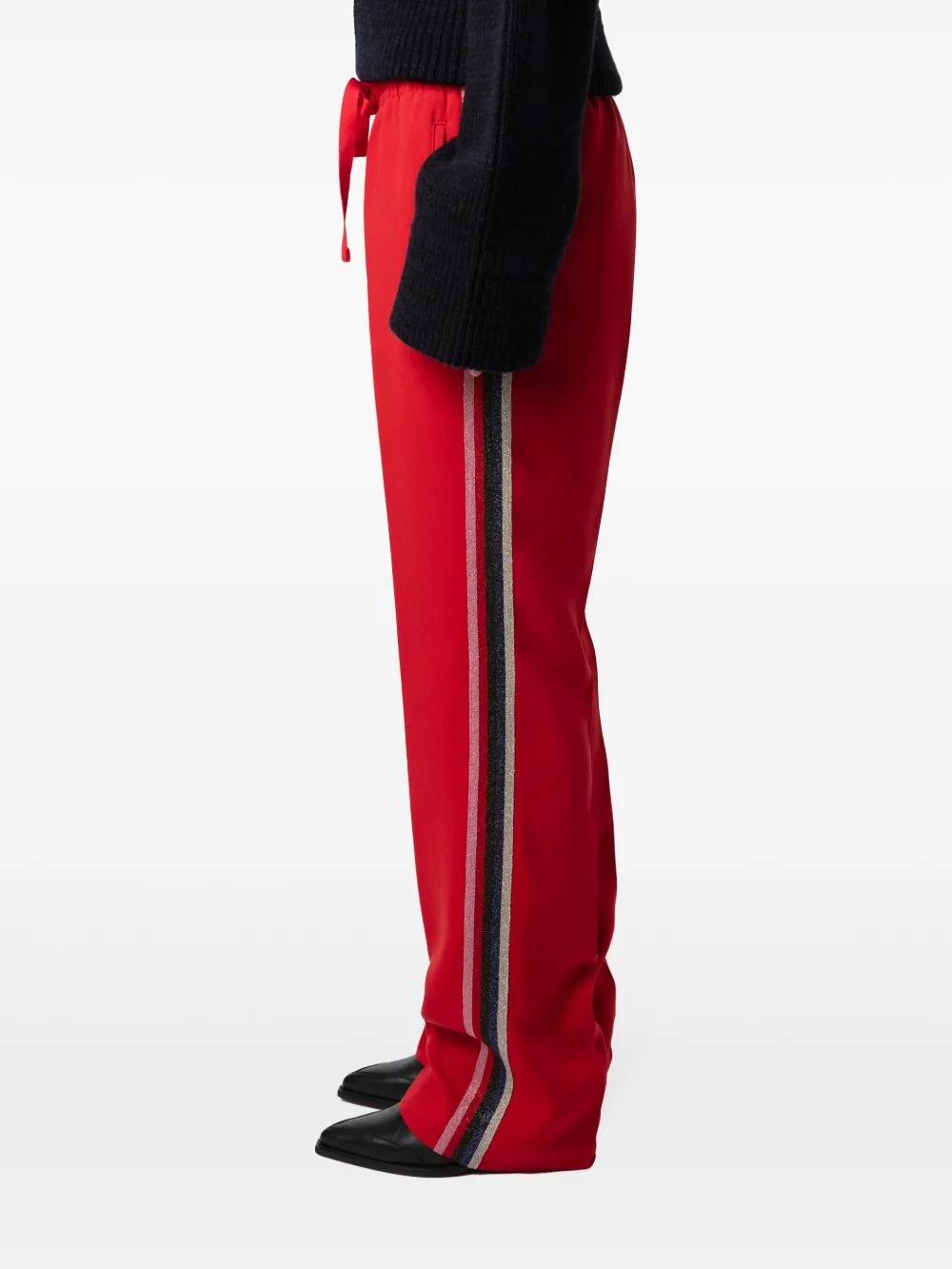 crimson crepe texture side stripe detailing glitter detailing pressed crease high-waisted elasticated drawstring waistband straight leg two side slit pockets