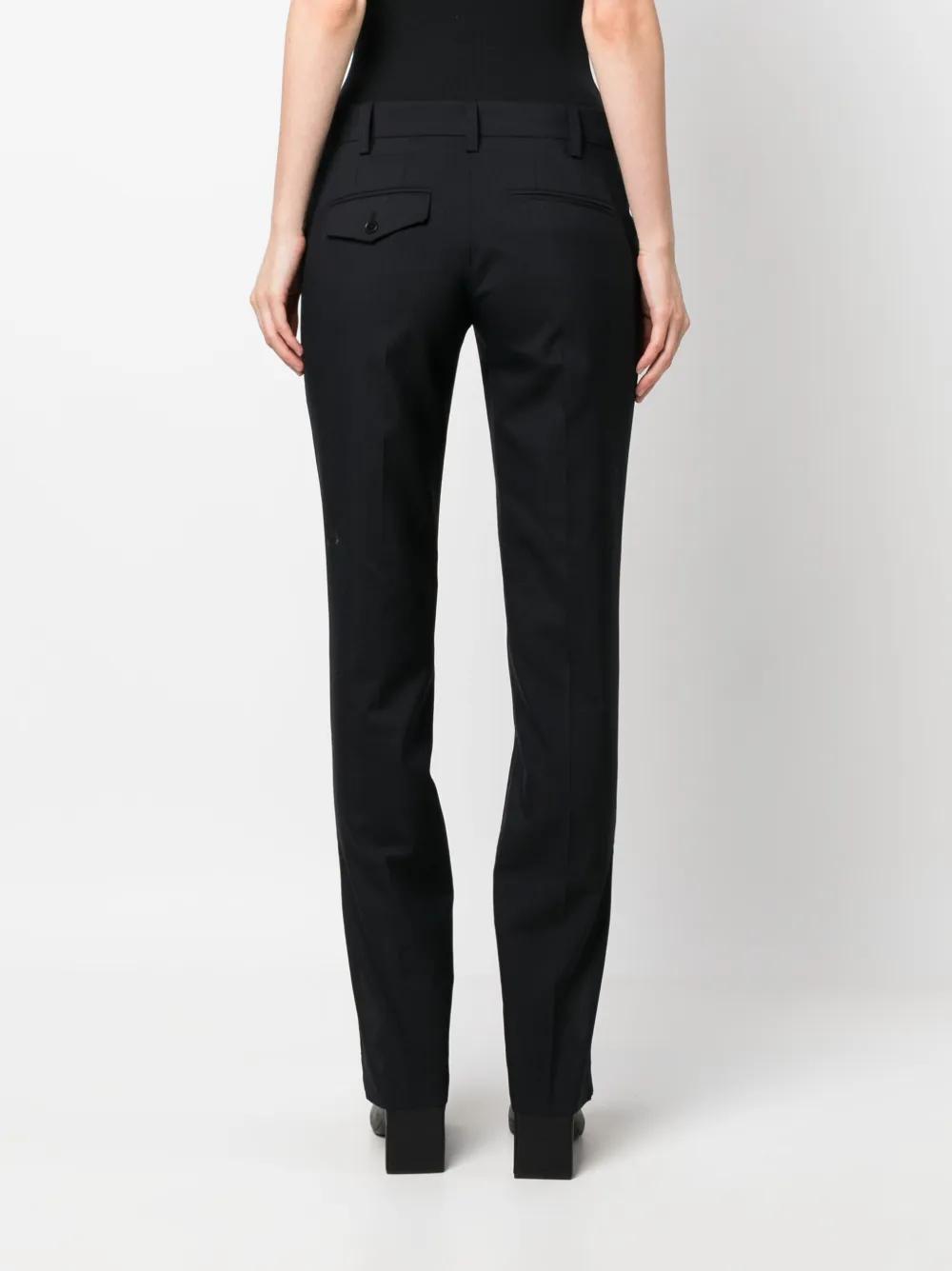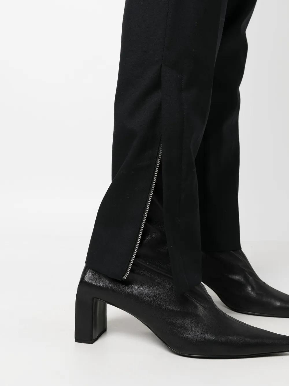 black organic wool belt loops ankle zips tailored cut concealed front fastening rear flap pocket rear welt pocket