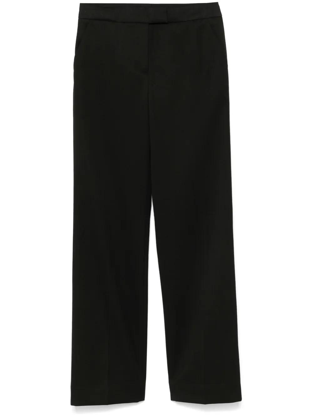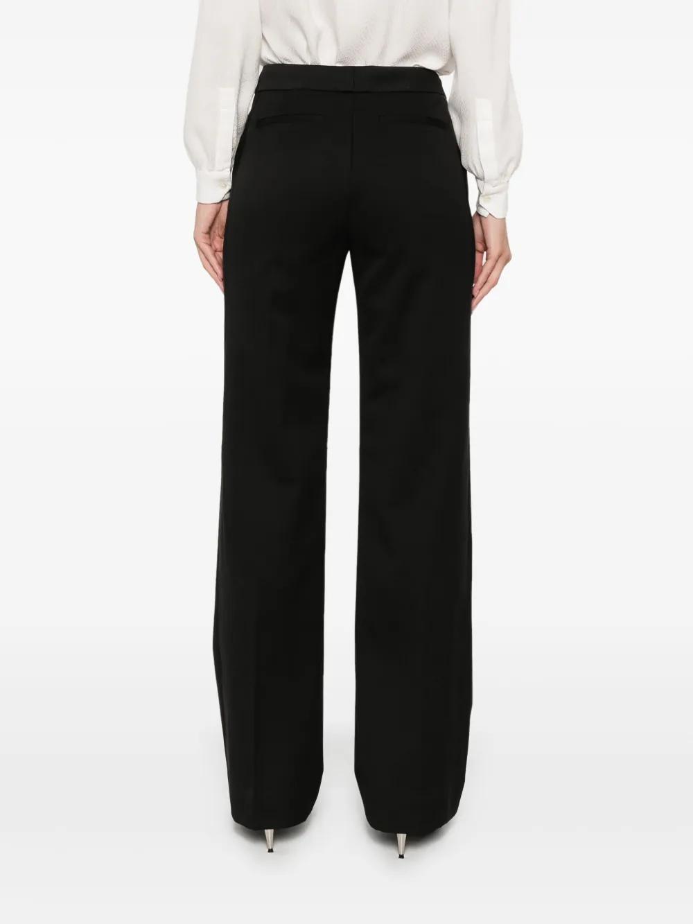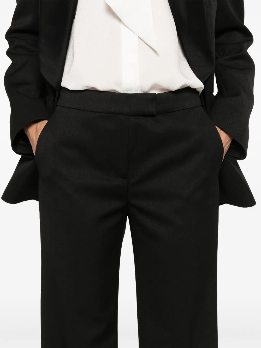 black wool blend concealed front button, hook and zip fastening tailored design two side slit pockets contrasting trim two rear welt pockets straight leg