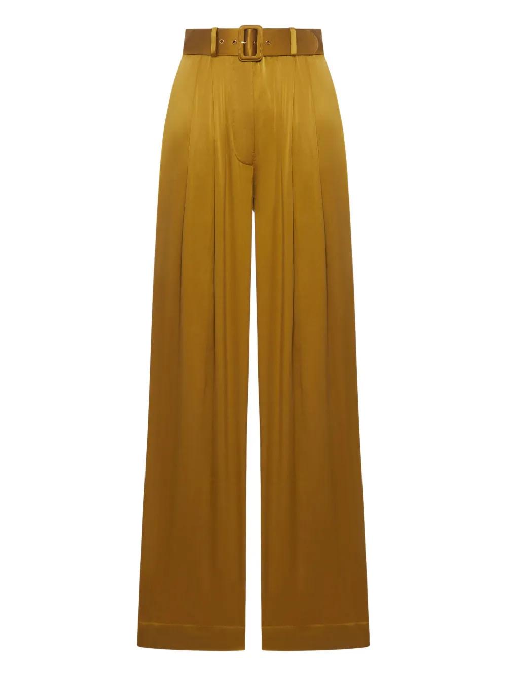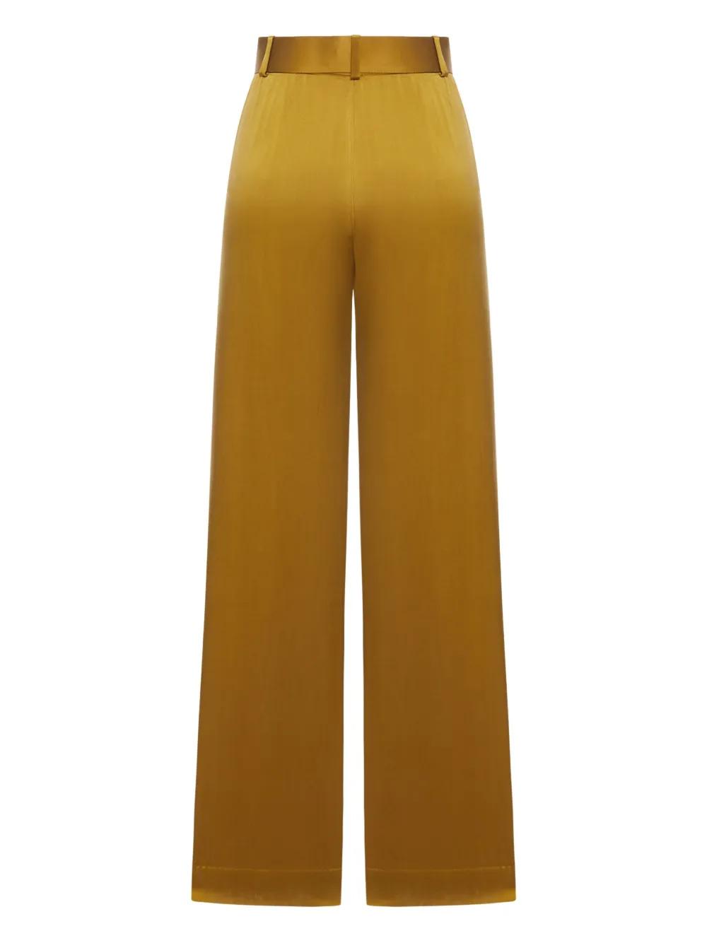 - Ten produkt został częściowo uszyty z poliestru pochodzącego z recyklingu. - Spodnie luźne w okolicy bioder i ud. - Prosta nogawka na całej długości. - Model z elastyczną wstawką. - Model z podwyższoną talią i zapięciem na suwak, guzik i haftkę. - Dwie wsuwane kieszenie boczne. - Model wykonany z materiału o satynowym splocie. - Szerokość w pasie: 35 cm. - Szerokość w biodrach: 50 cm. - Wysokość stanu: 31 cm. - Szerokość nogawki na dole: 34 cm. - Szerokość nogawki: 32 cm. - Długość zewnętrzna nogawki: 112 cm. - Wymiary podane dla rozmiaru: 36.