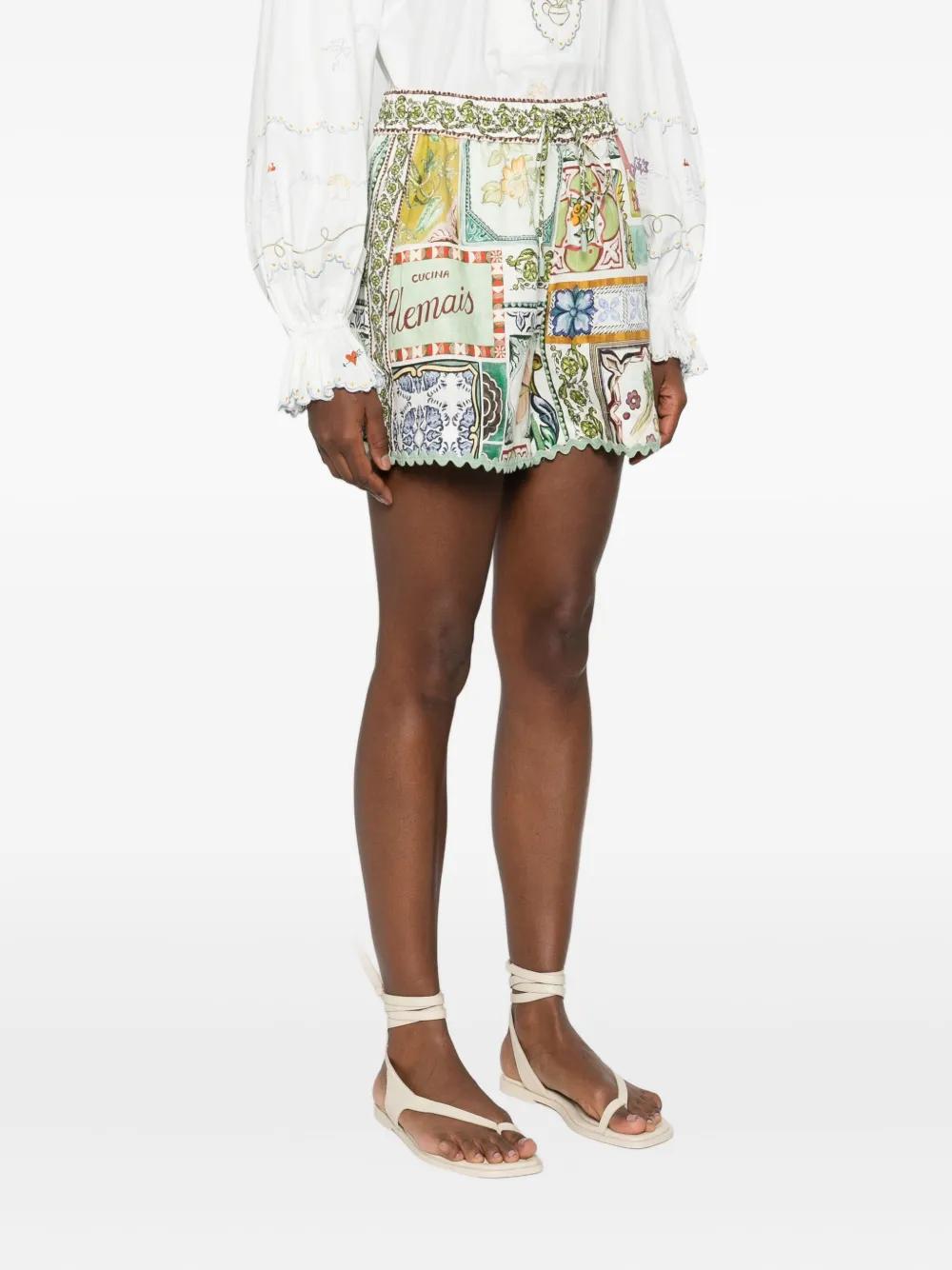 white and multicoloured printed design scalloped hem elasticated waistband embroidered trim