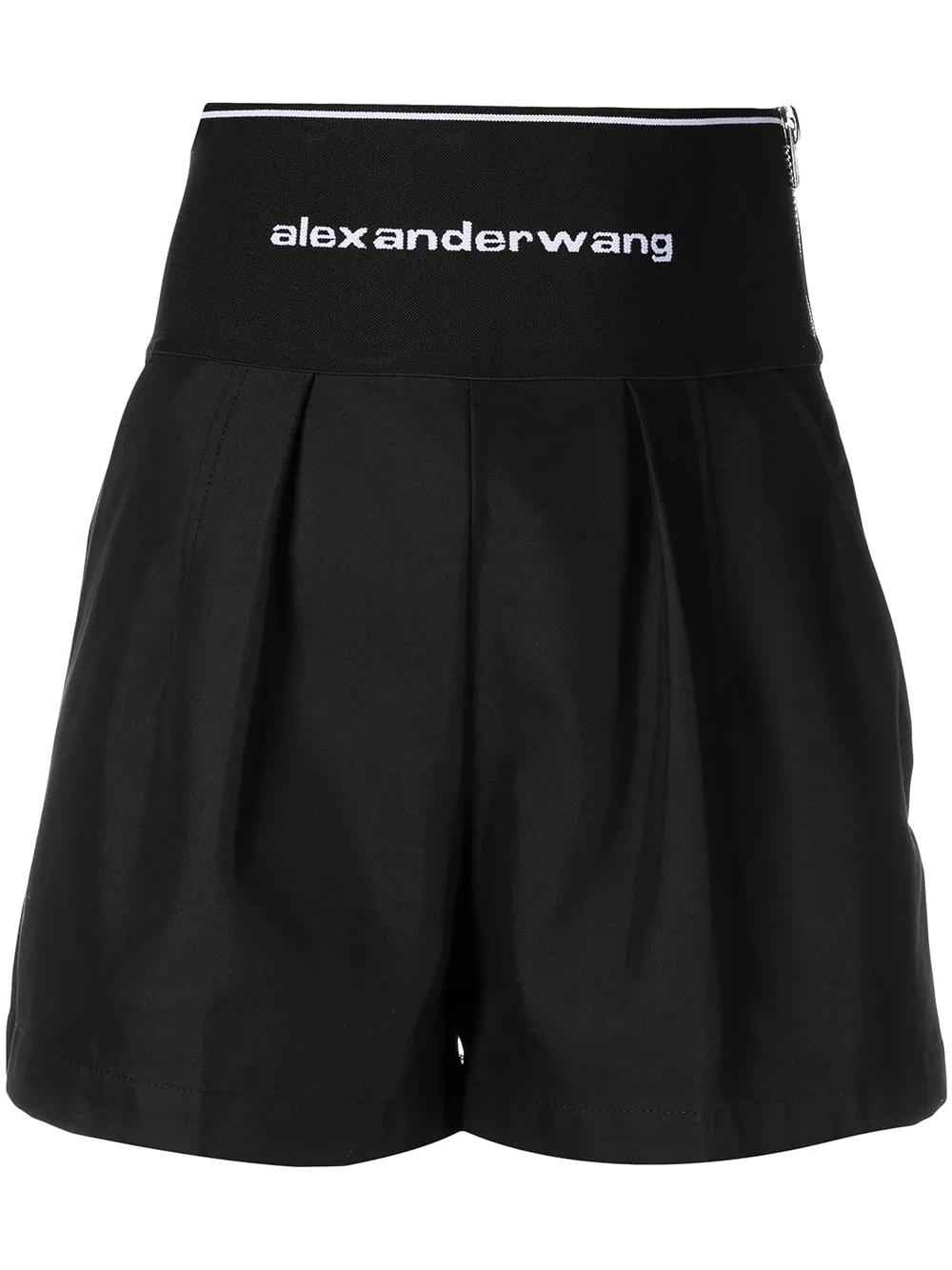 black cotton-blend high waist logo waistband rear welt pocket side zip fastening A-line