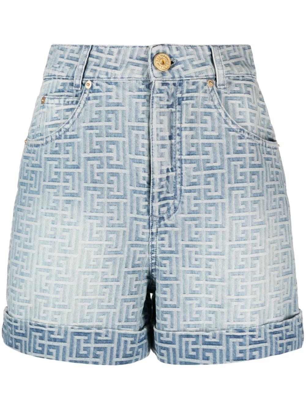 Balmain monogram-print cotton denim shorts - Blue