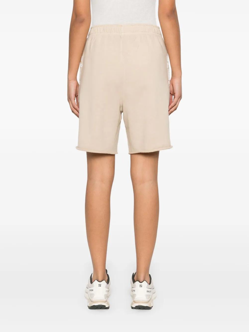 light beige elasticated waistband two side inset pockets raw-cut hem logo print at the leg