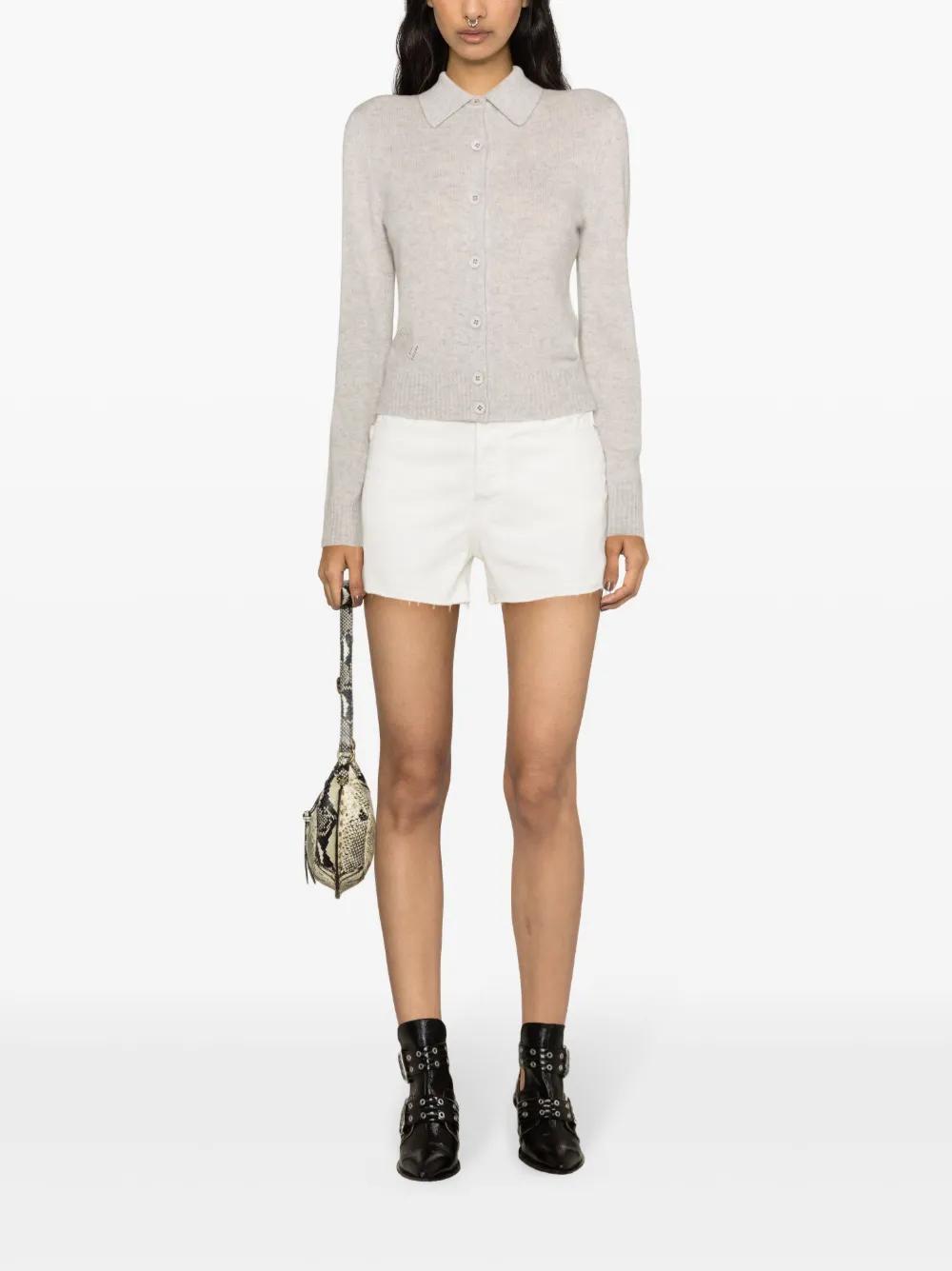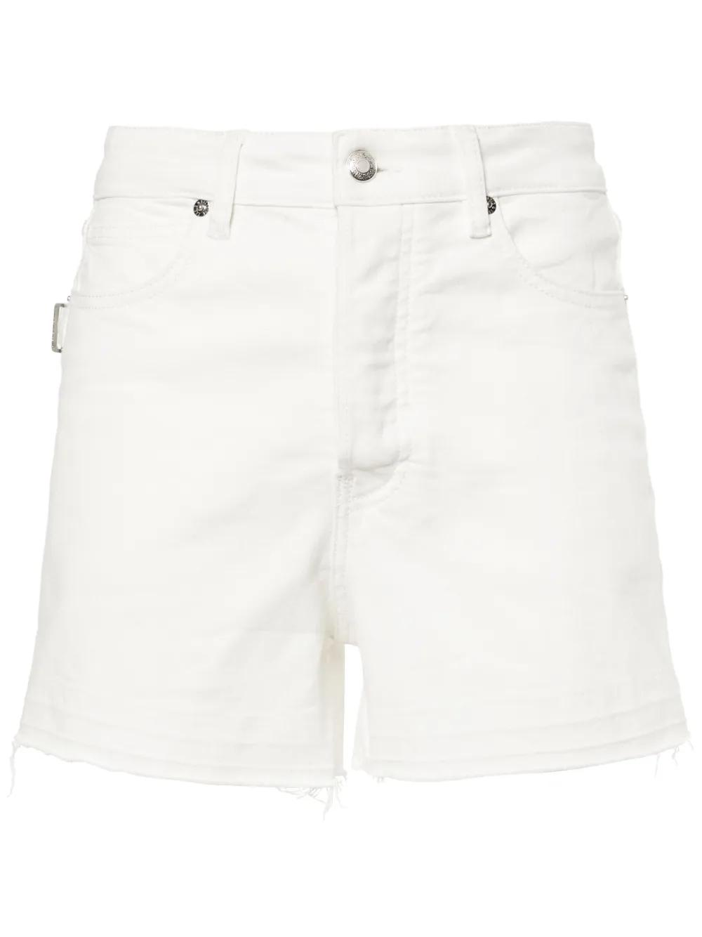 white stretch organic cotton denim high-waisted belt loops front button fastening classic five pockets wide leg frayed hem above-knee length