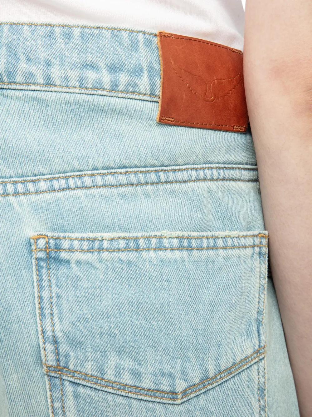 light blue concealed fly and button fastening classic five pockets belt loops whiskering effect