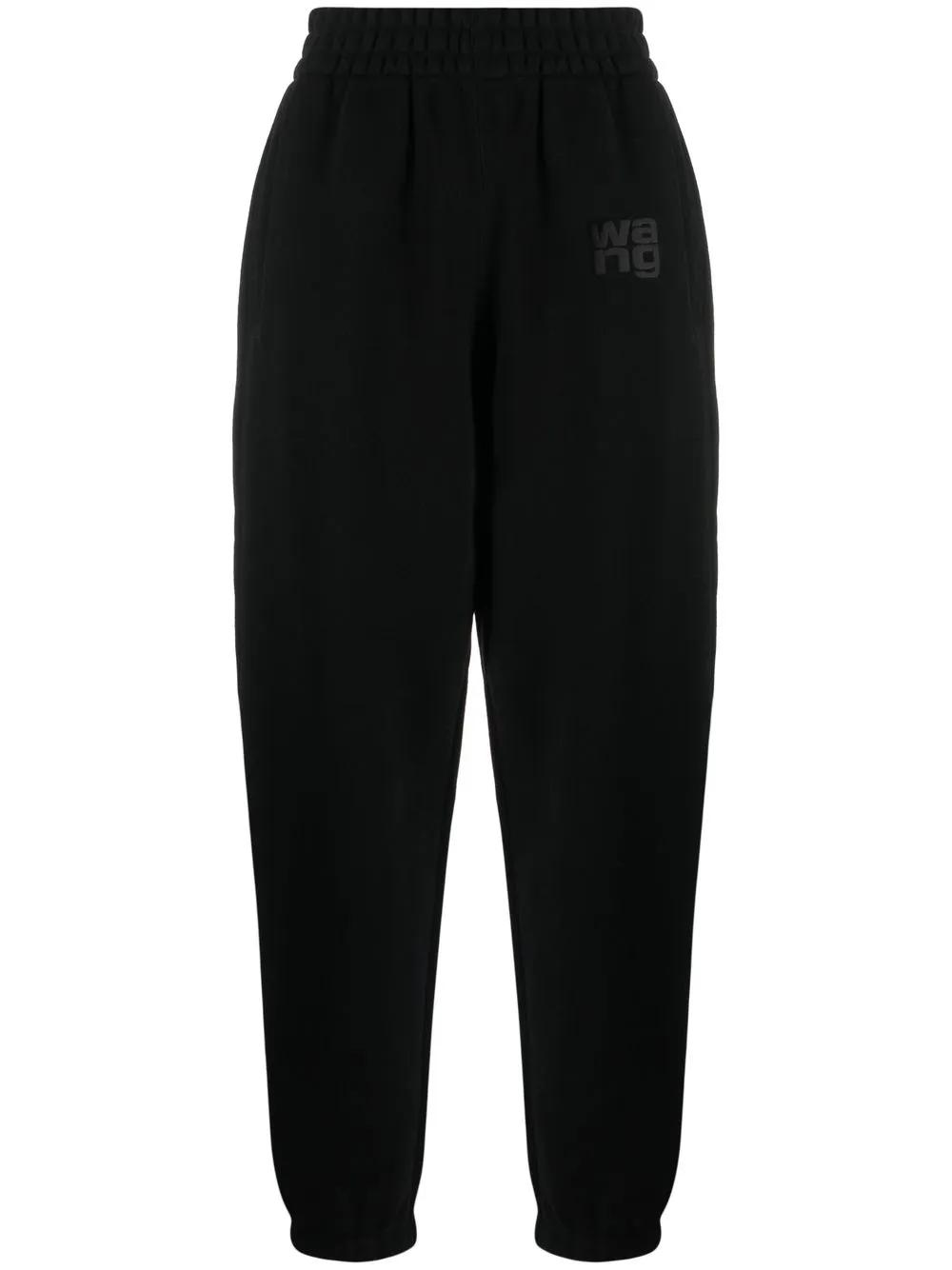 black cotton blend jersey fleece logo print to the front high waist elasticated waistband tapered leg elasticated ankles
