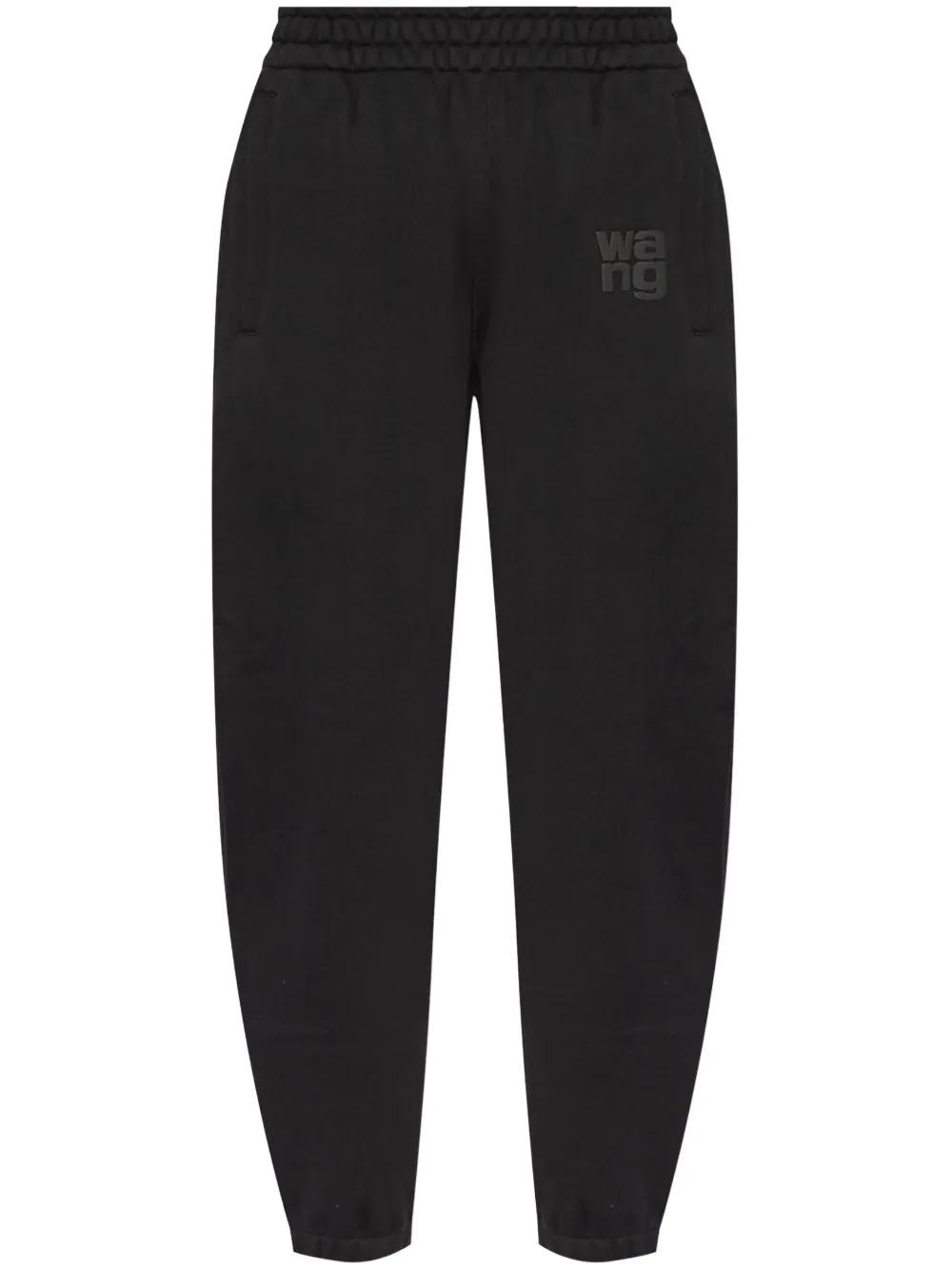 black cotton jersey texture elasticated waistband appliqué logo slip pockets to the sides tapered leg elasticated cuffs