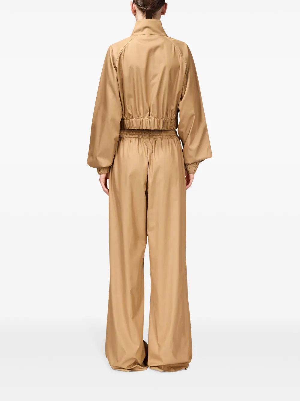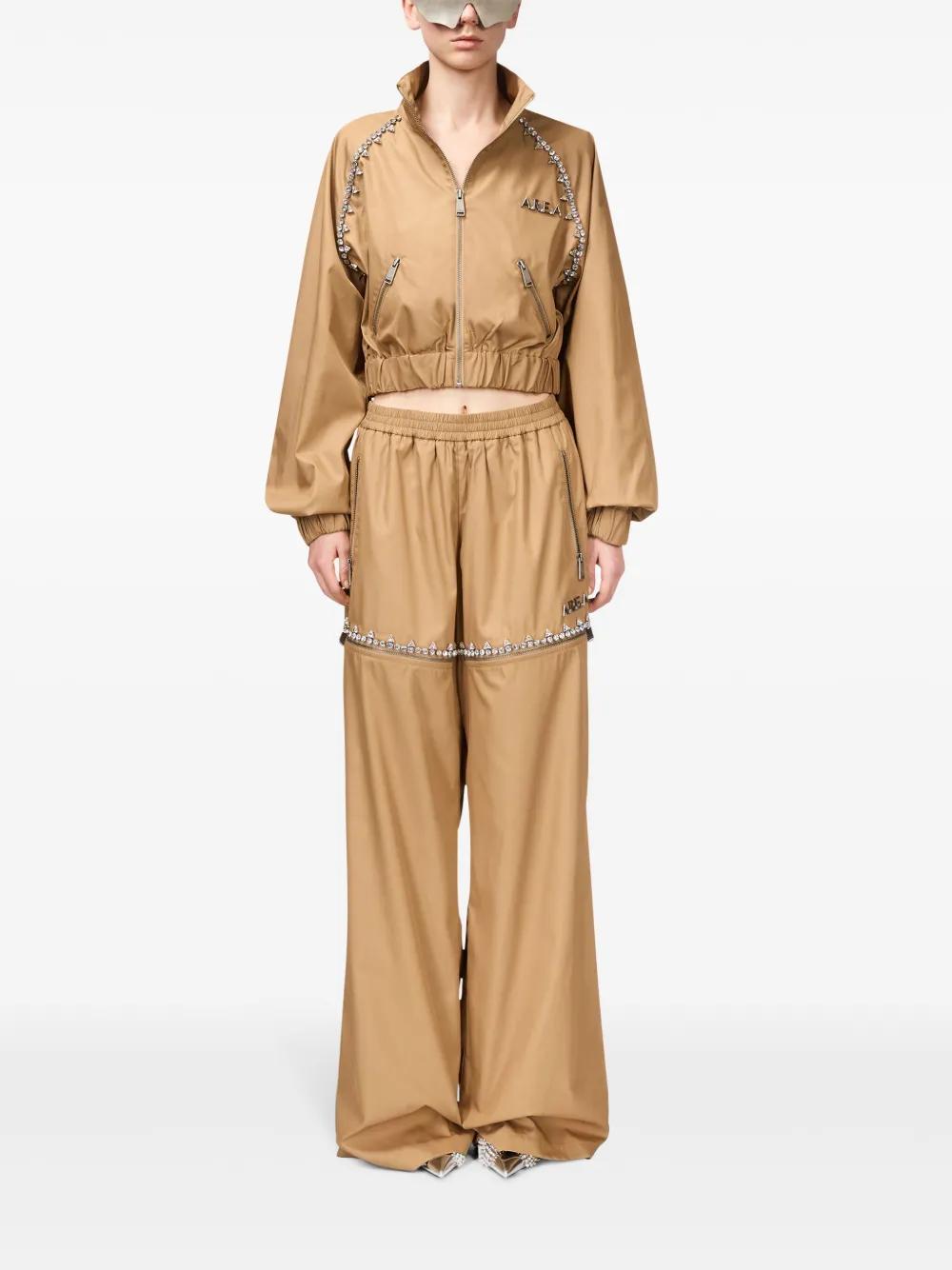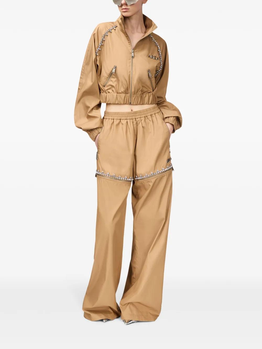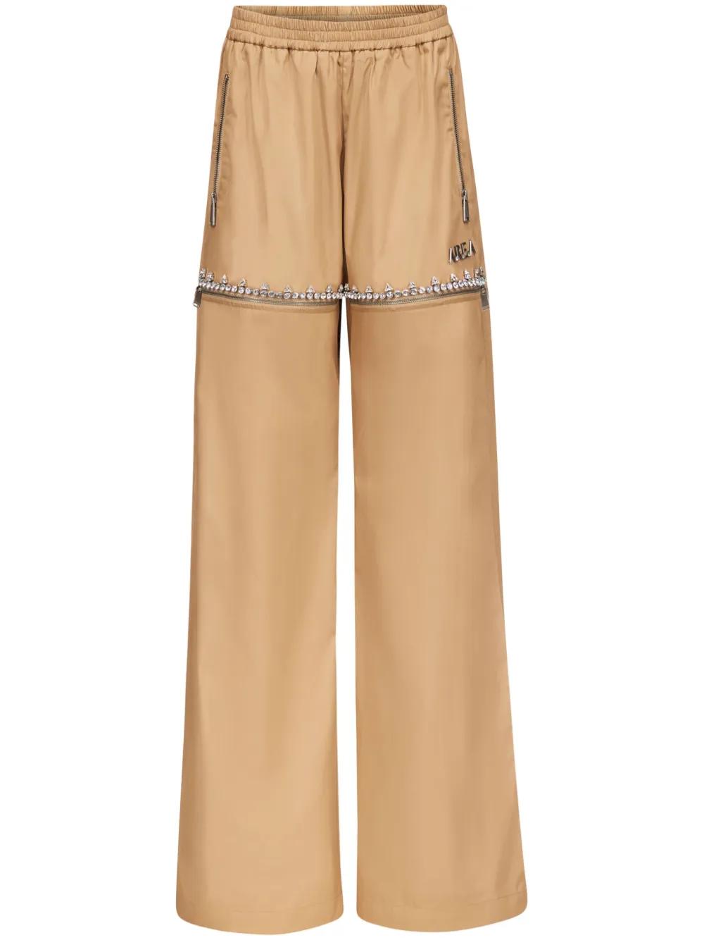 brown elasticated waistband mid-rise two side zip-fastening pockets silver-tone logo plaque crystal embellishment decorative zip detailing wide leg extra-long length