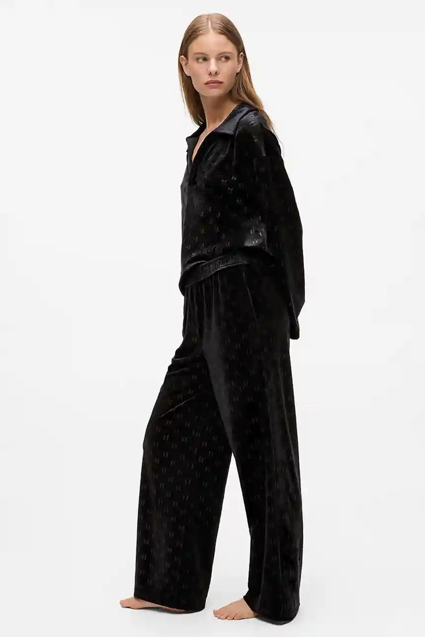 - Prosty, nie blokujący ruchów fason. - Elastyczna listwa w pasie. - Rozszerzana nogawka. - Gładka dzianina.