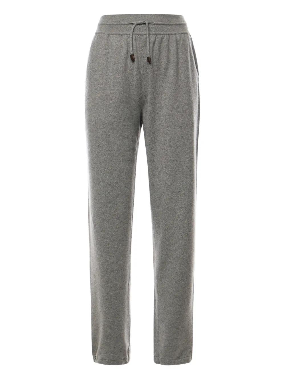 light grey drawstring fastening side diagonal pockets elasticated waistband cashmere