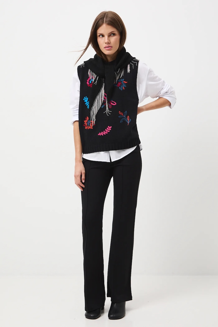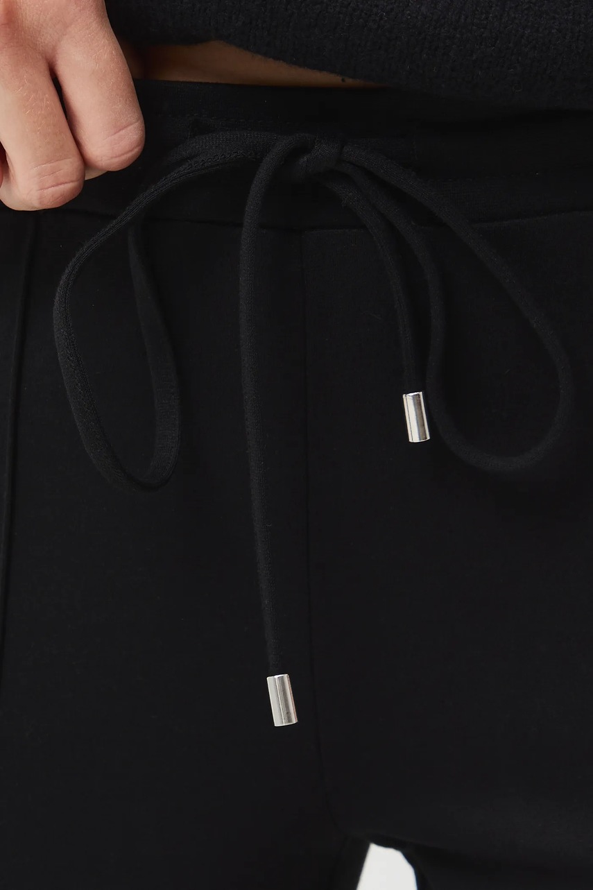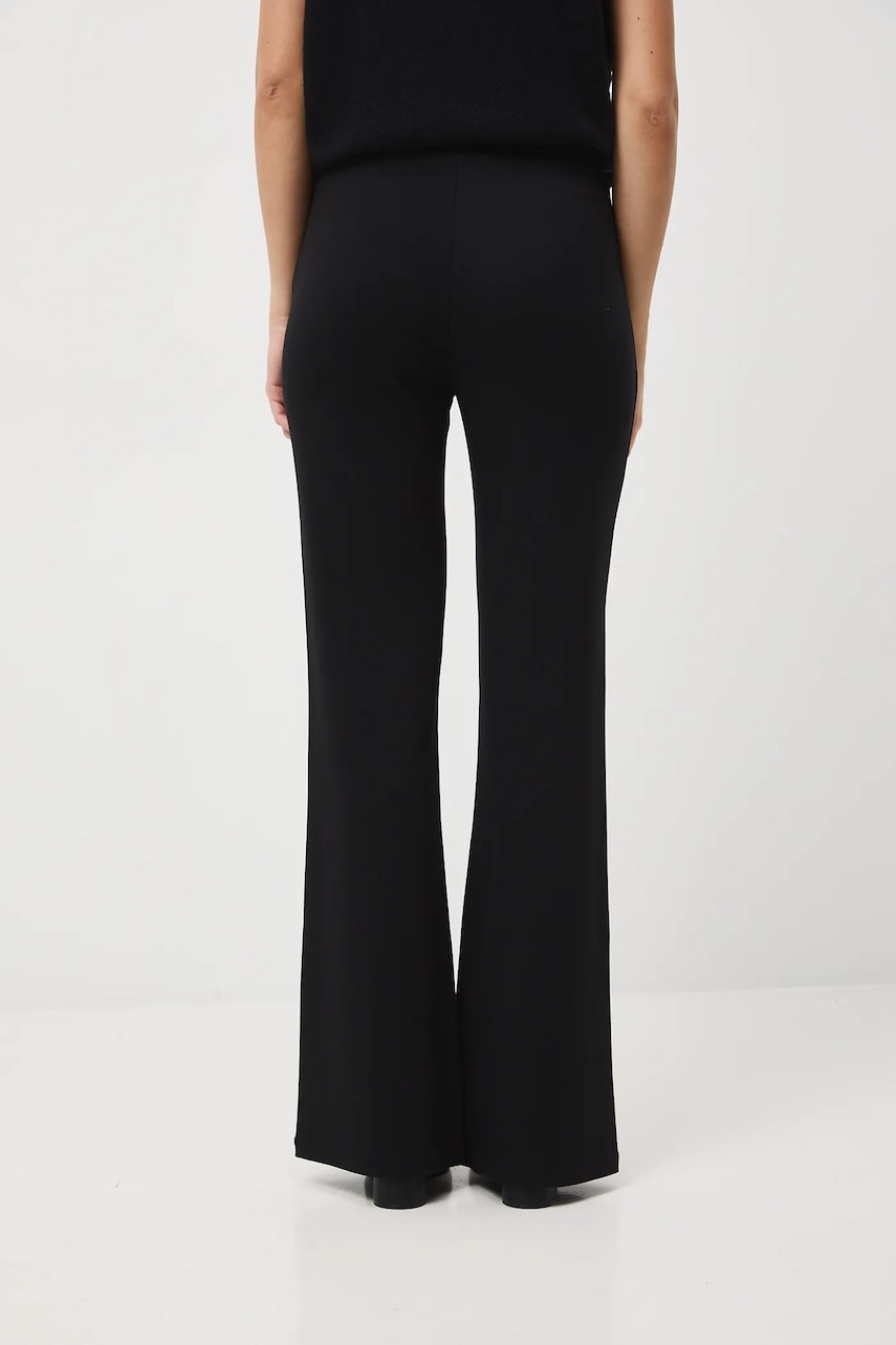 - Fason flare. - Regularna talia. - W pasie elastyczna listwa z troczkami. - Szeroka nogawka. - Ozdobne przeszycia. - Gładka dzianina. - Szerokość w pasie: 39 cm. - Szerokość w biodrach: 44,5 cm. - Wysokość stanu: 24 cm. - Szerokość nogawki na dole: 28 cm. - Długość wewnętrzna nogawki: 82 cm. - Wymiary podane dla rozmiaru: S.