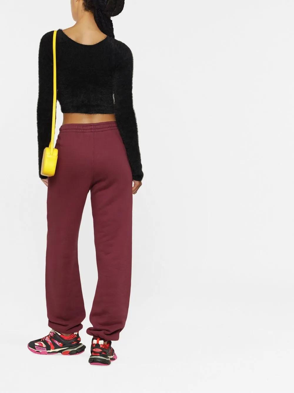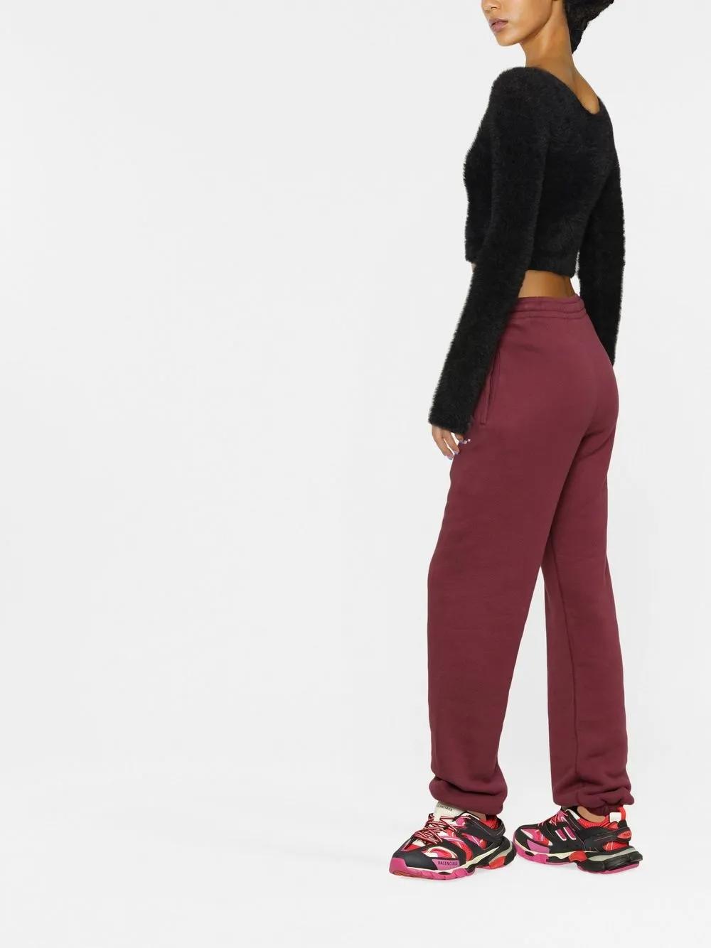 burgundy cotton logo print at the leg elasticated waistband elasticated ankles straight leg two side pouch pockets