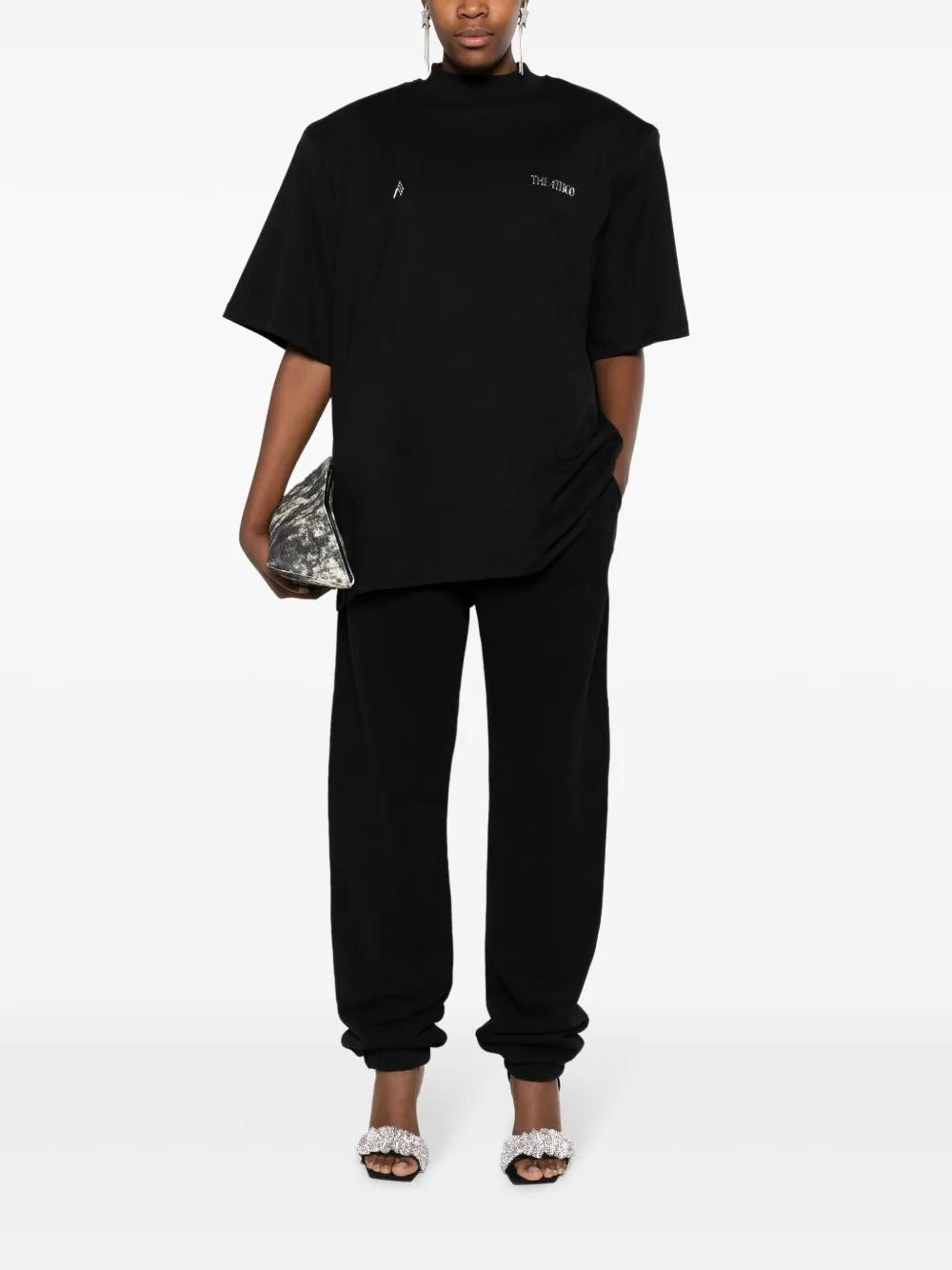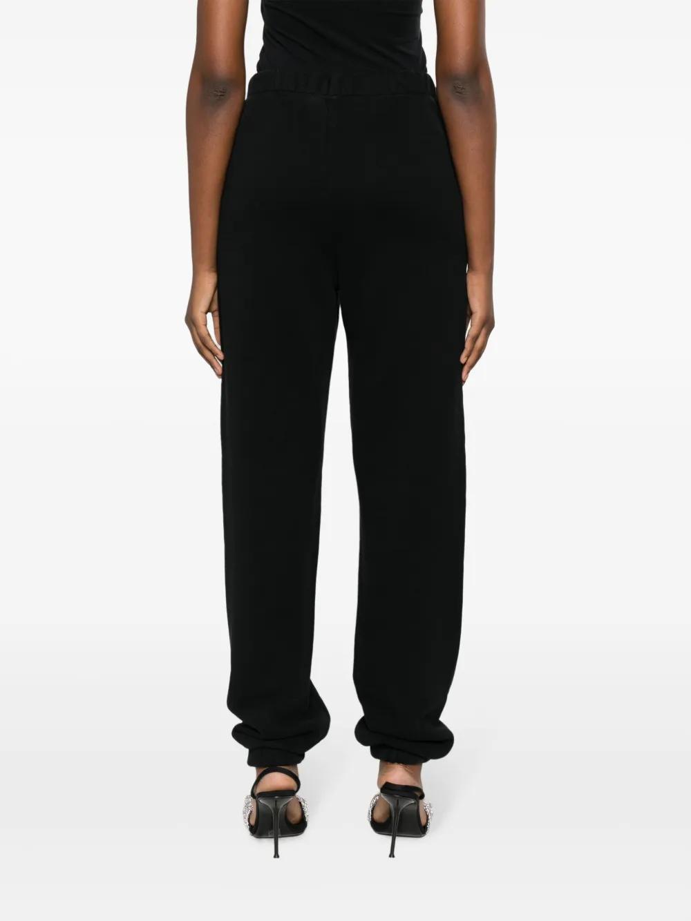 black cotton gauzed fleece embossed logo to the front high waist rear elasticated waistband two diagonal pockets to the sides tapered leg elasticated ankles