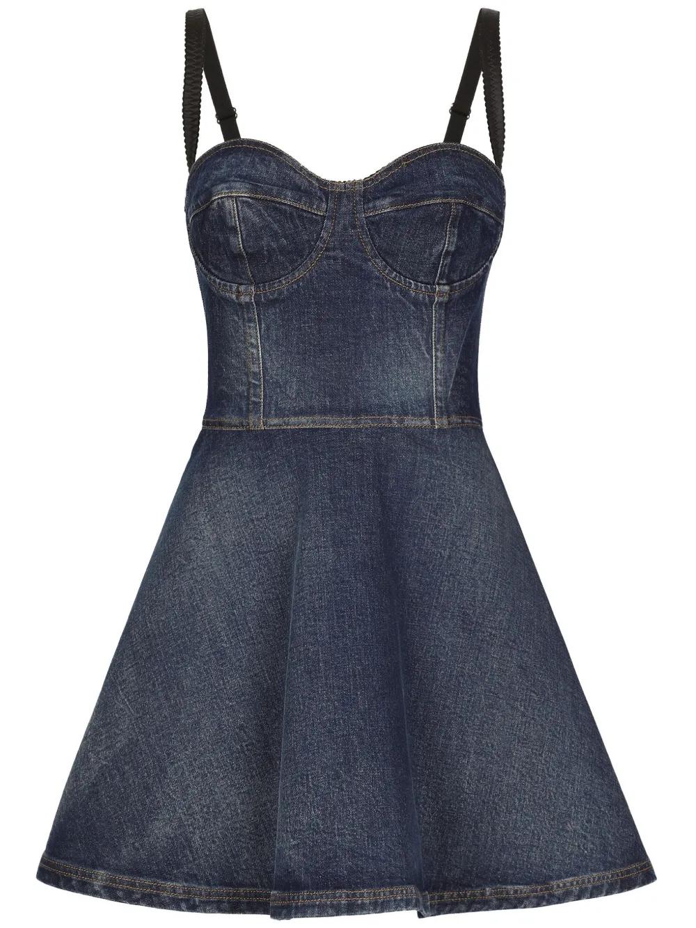 navy blue cotton-silk blend stretch-design washed denim corset style sweetheart neck rear zip fastening sleeveless flared hem thigh-length
