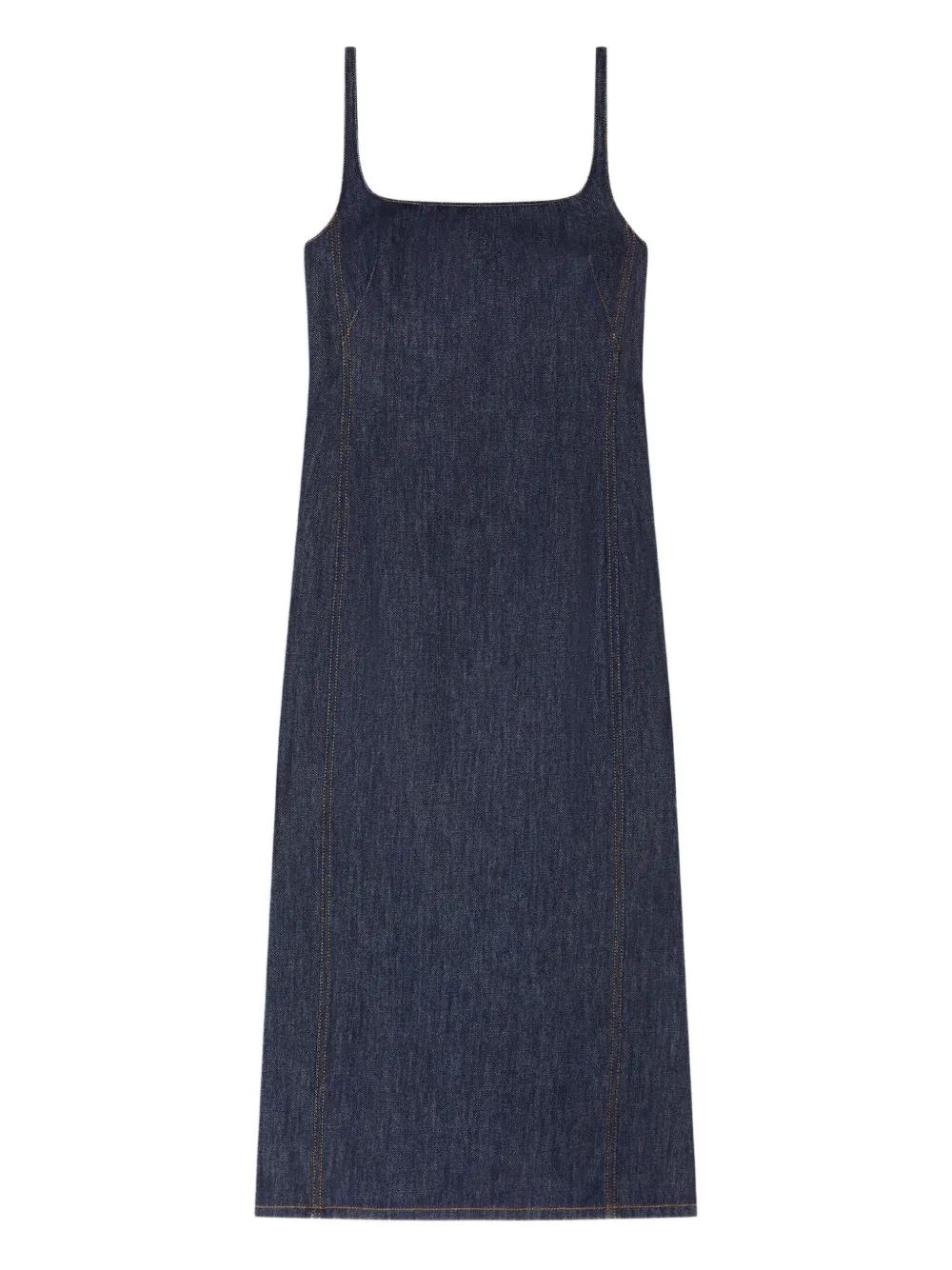 indigo blue cotton material square neckline sleeveless midi length centre-back zip fastening