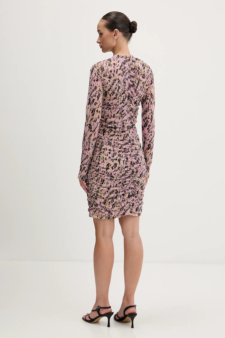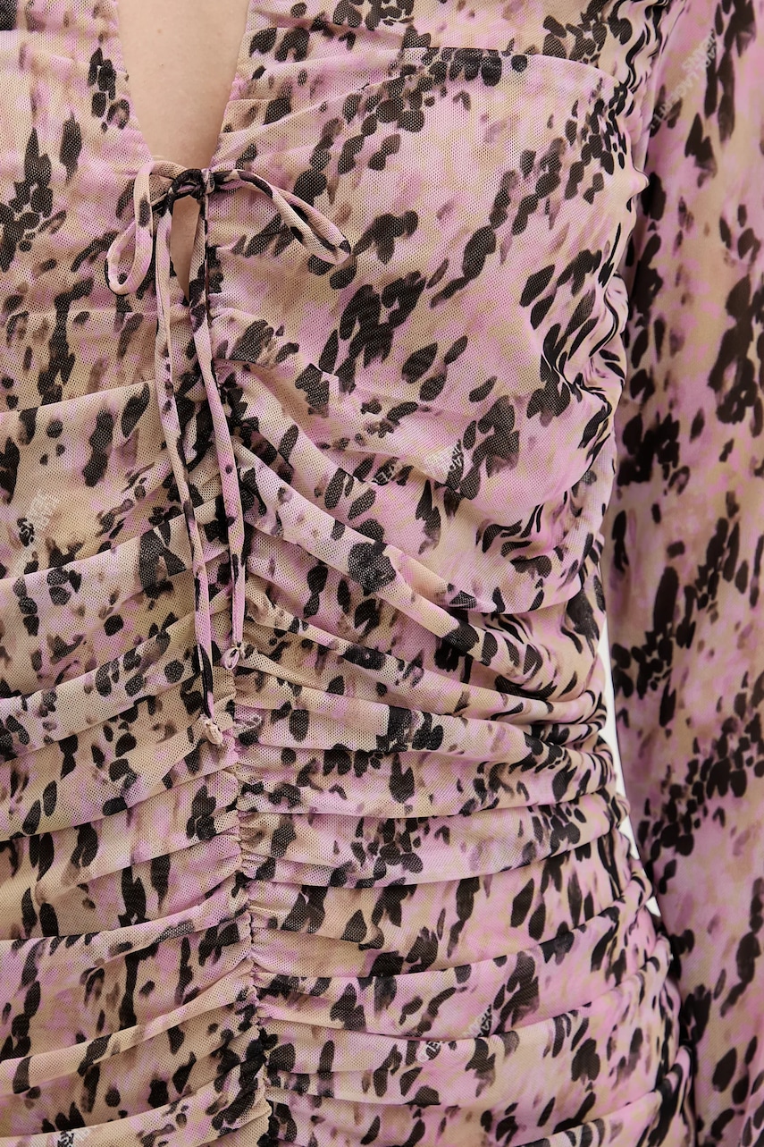 - Dopasowany fason z efektownymi marszczeniami. - Model o długości mini. - Wiązany dekolt. - Kryte zapięcie na suwak. - Długie rękawy. - Model na podszewce. - Wzorzysty materiał. - Długość rękawa: 75 cm. - Długość: 91 cm. - Szerokość pod pachami: 39 cm. - Wymiary podane dla rozmiaru: S.