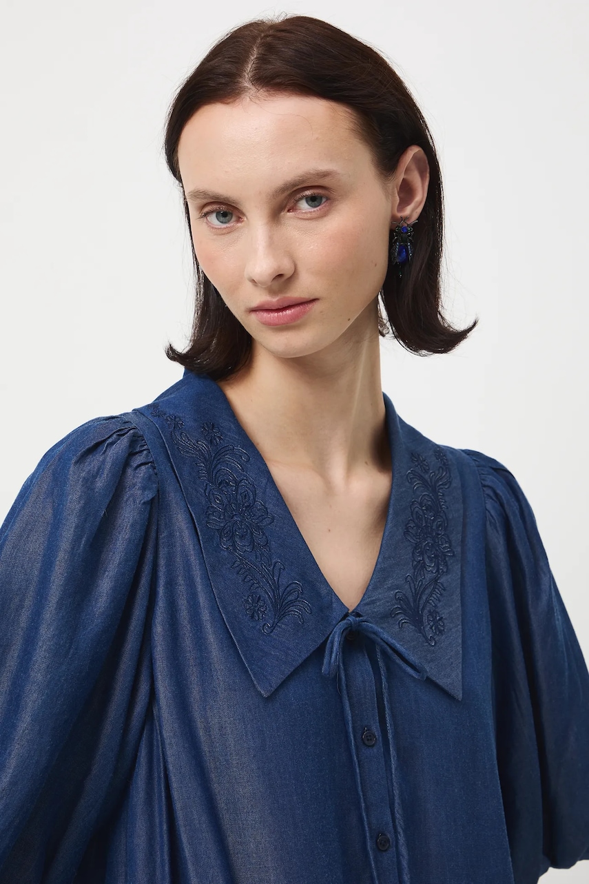 - Luźny fason. - Bufiaste rękawy. - Rękaw trzy czwarte. - Spiczasty dekolt z kołnierzykiem. - Krótkie zapięcie na guziki. - Model z ozdobnym haftem. - Ozdobne marszczenia. - Model o długości mini. - Model wykonany z lyocellu. - Długość: 91 cm. - Szerokość w biuście: 51,5 cm. - Szerokość w talii: 55,7 cm. - Wymiary podane dla rozmiaru: S.