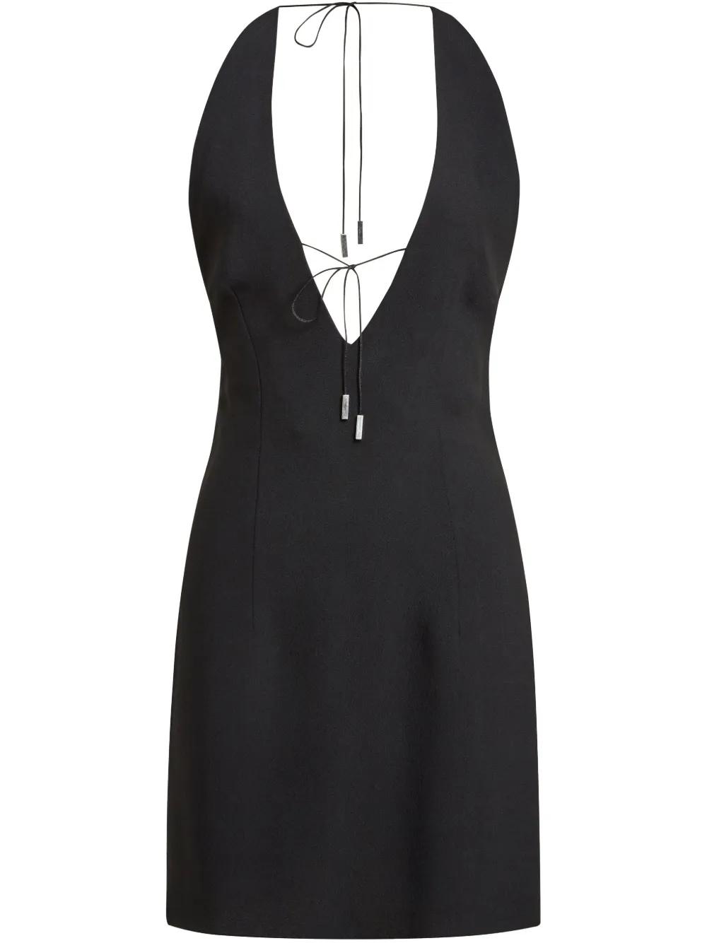 black crepe texture rear tie fastening spaghetti straps plunging V-neck sleeveless draped detailing open back fitted waistline straight hem thigh-length