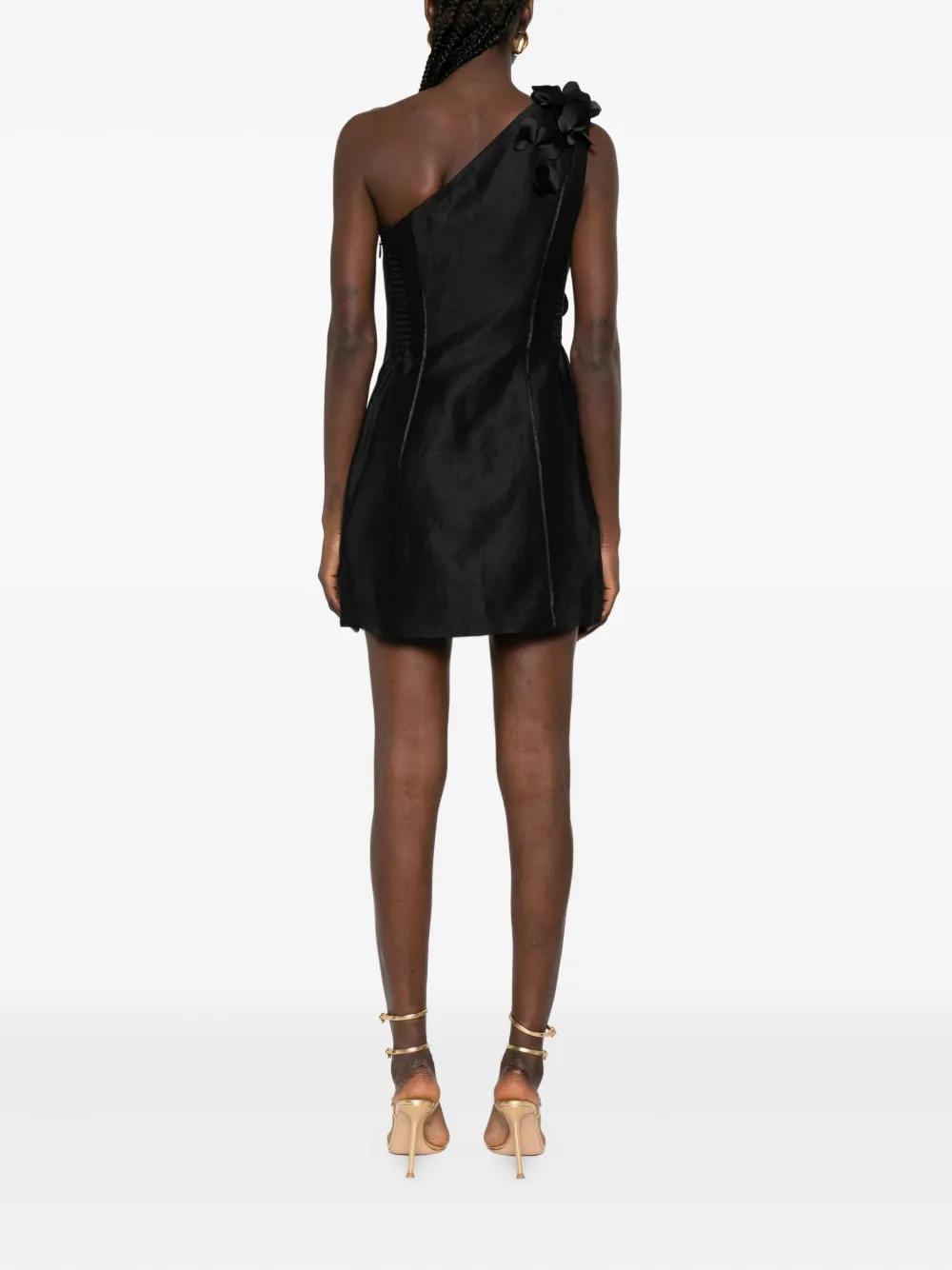 black one-shoulder design mini length floral appliqué sleeveless