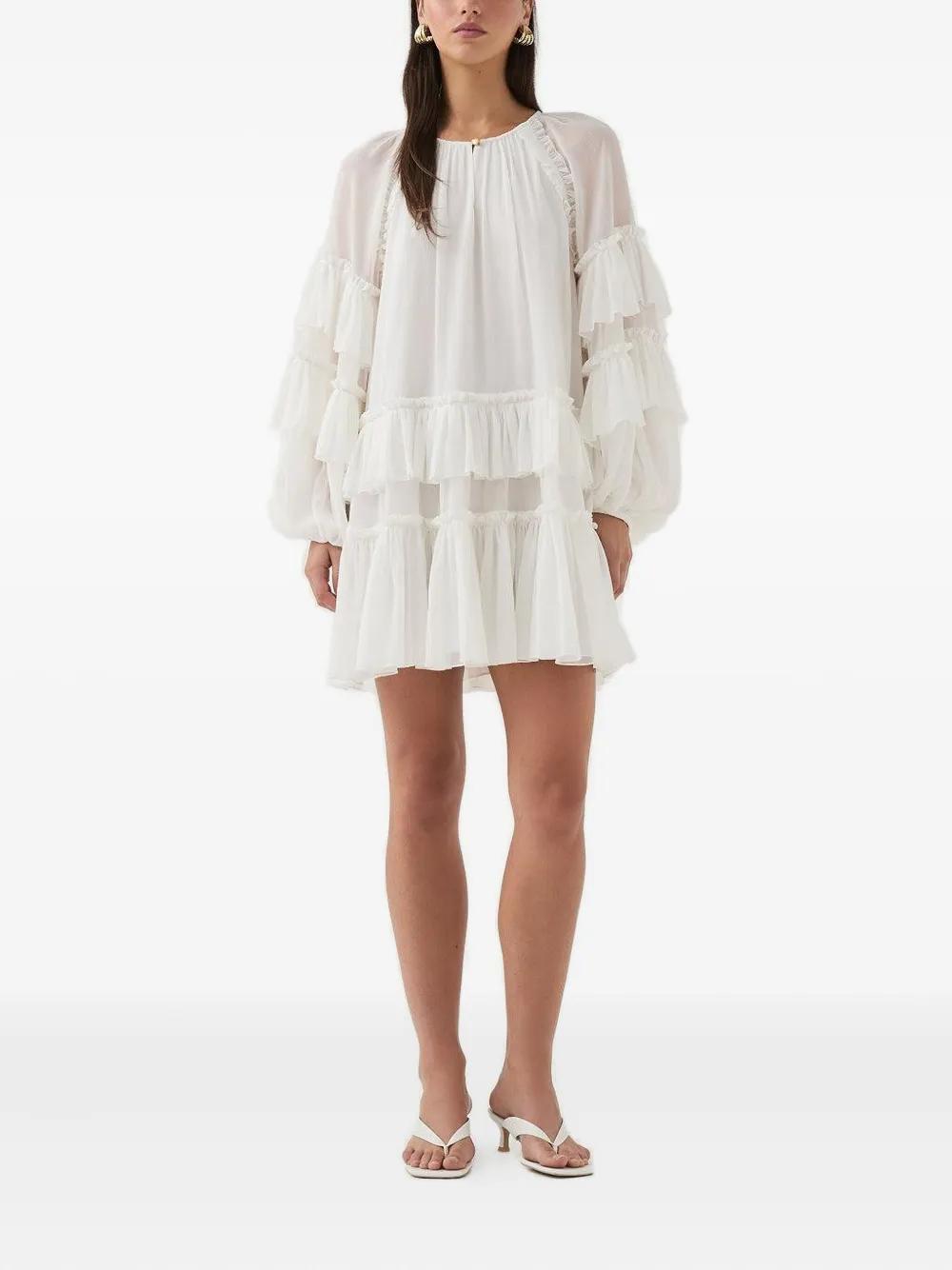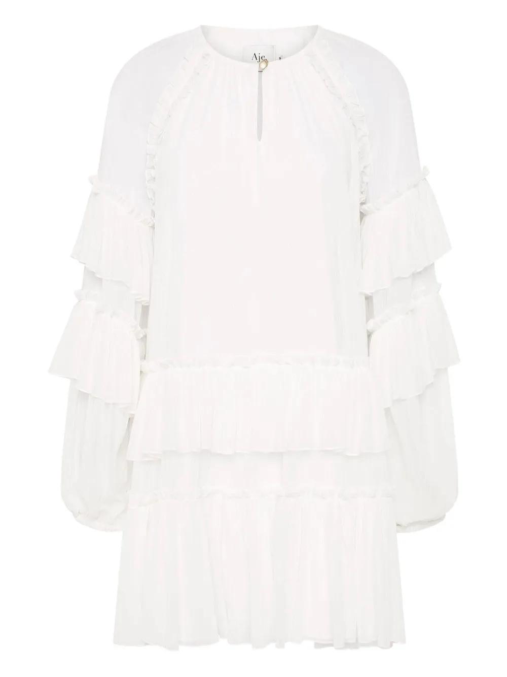 white layered ruffles round neck long sleeves balloon sleeves keyhole detail frilled cuffs