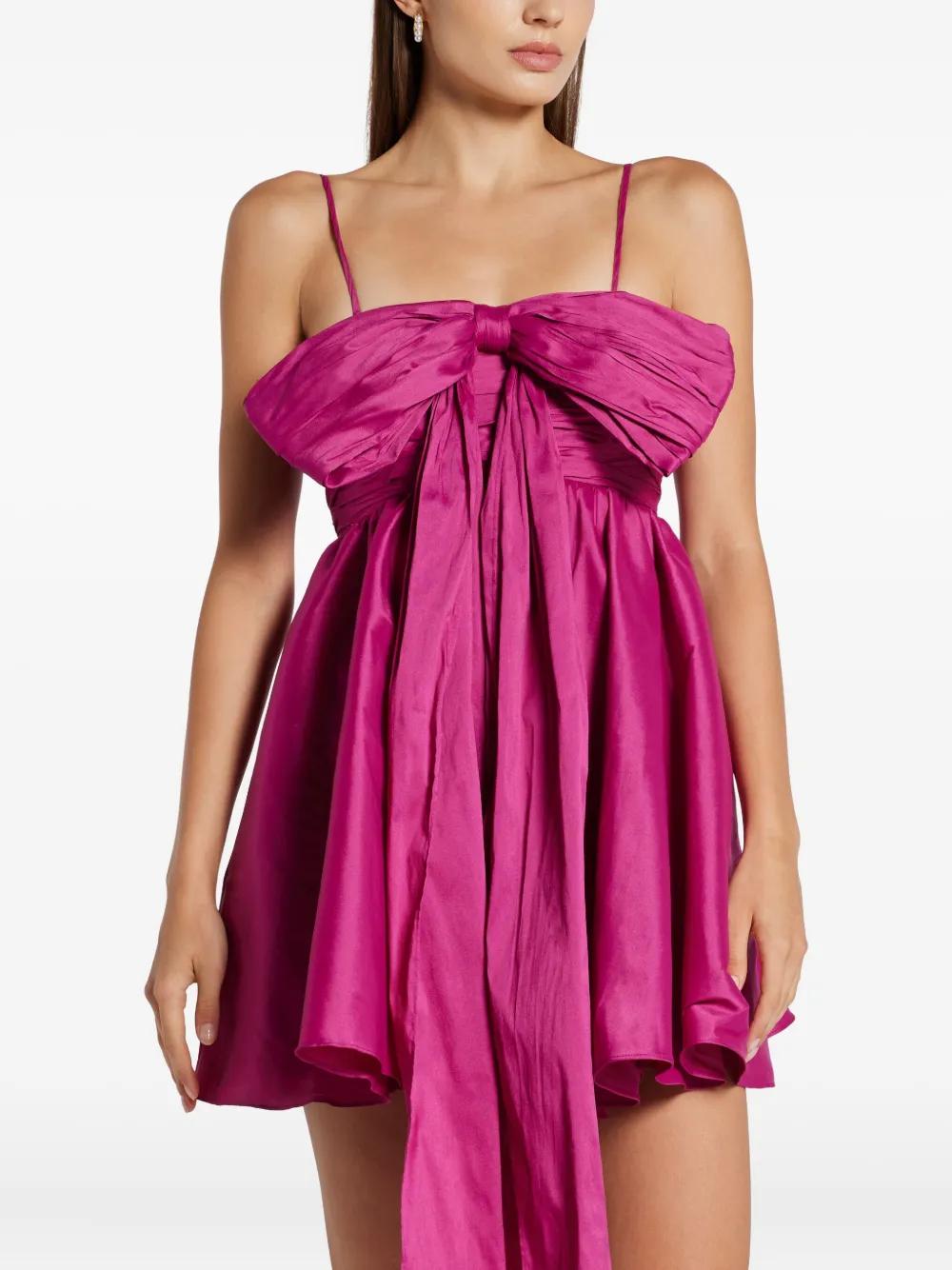 fuchsia pink strap detailing oversized bow low neckline flowing silhouette draped tie feature
