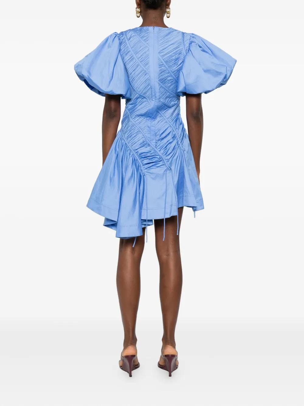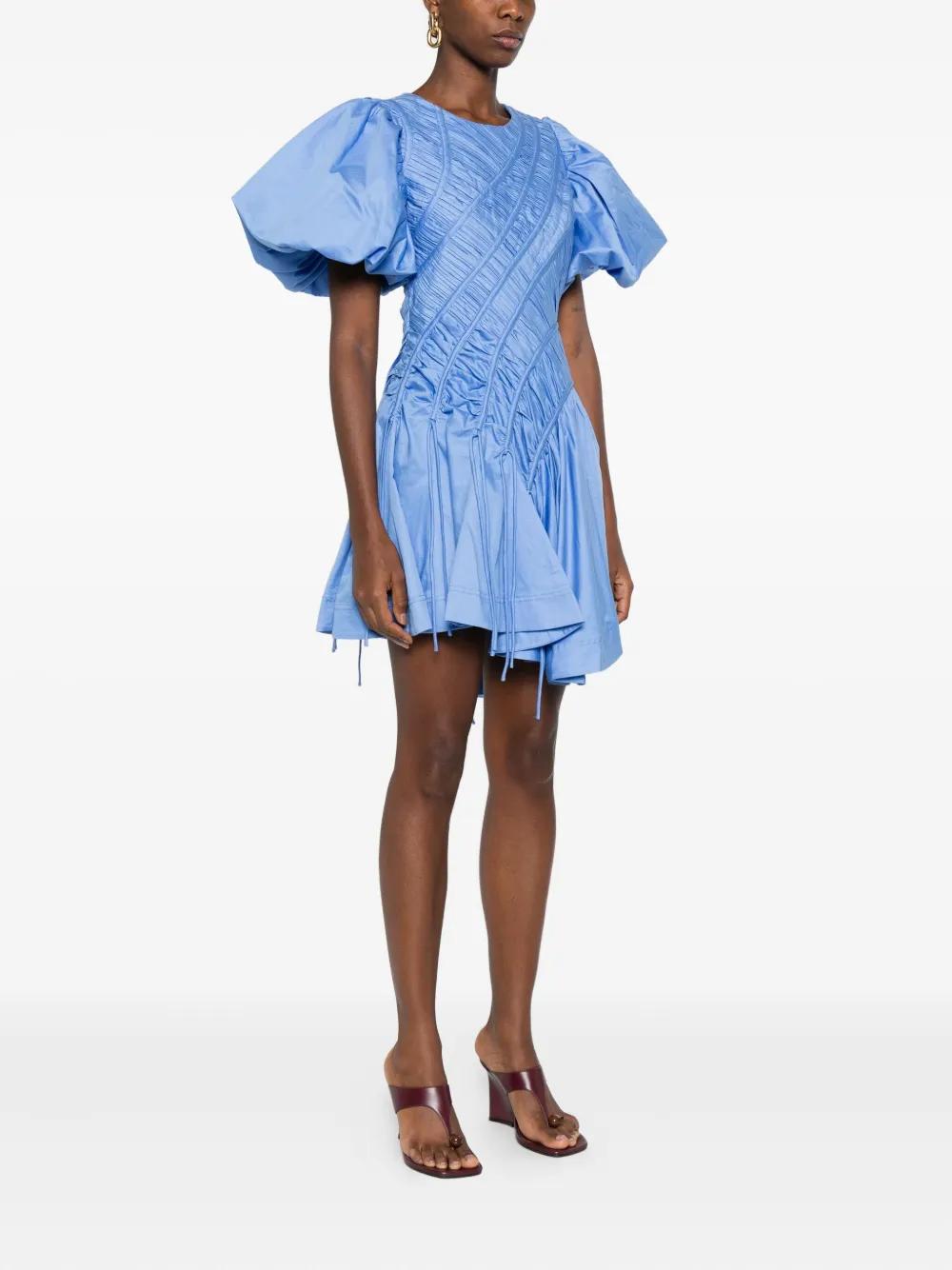 light blue short puff sleeves gathered detailing fitted bodice above-knee length