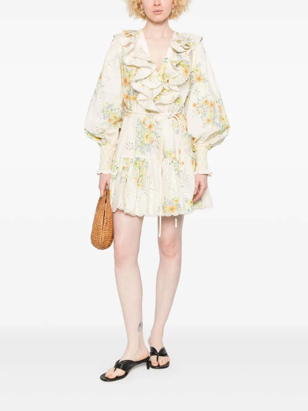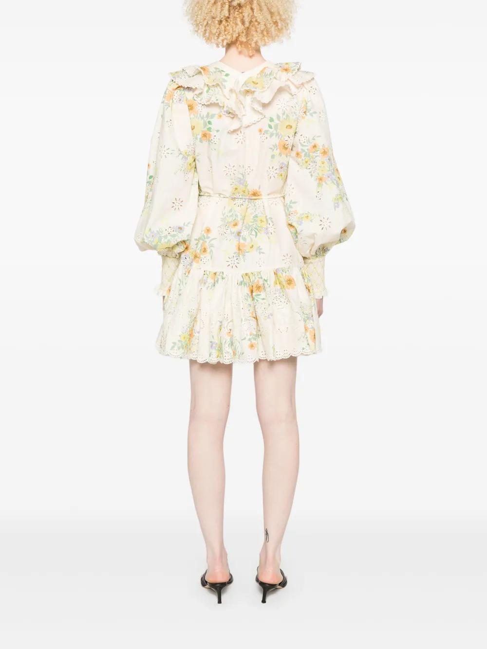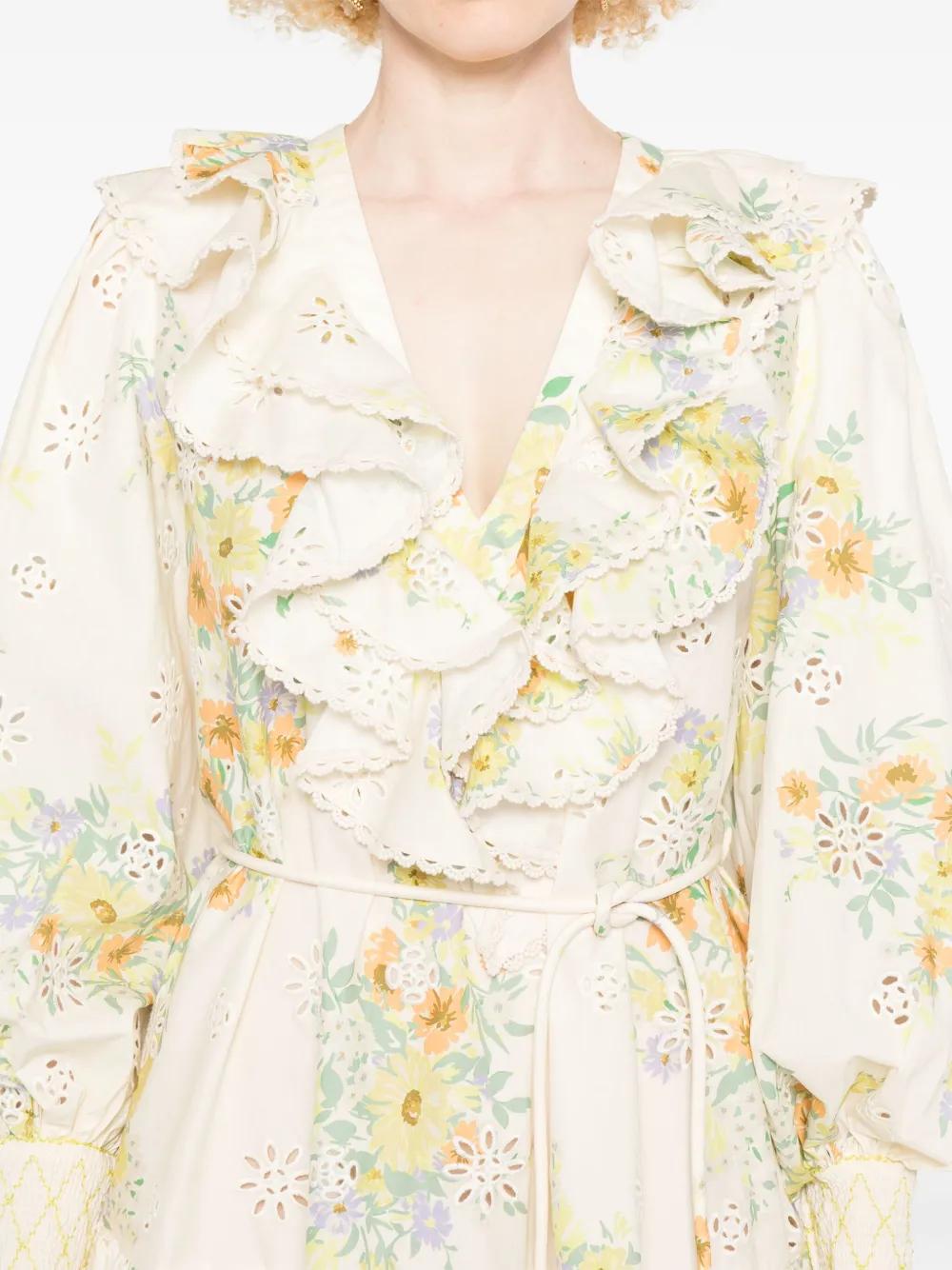 light beige concealed rear zip fastening balloon sleeves ruffled trim smocking details