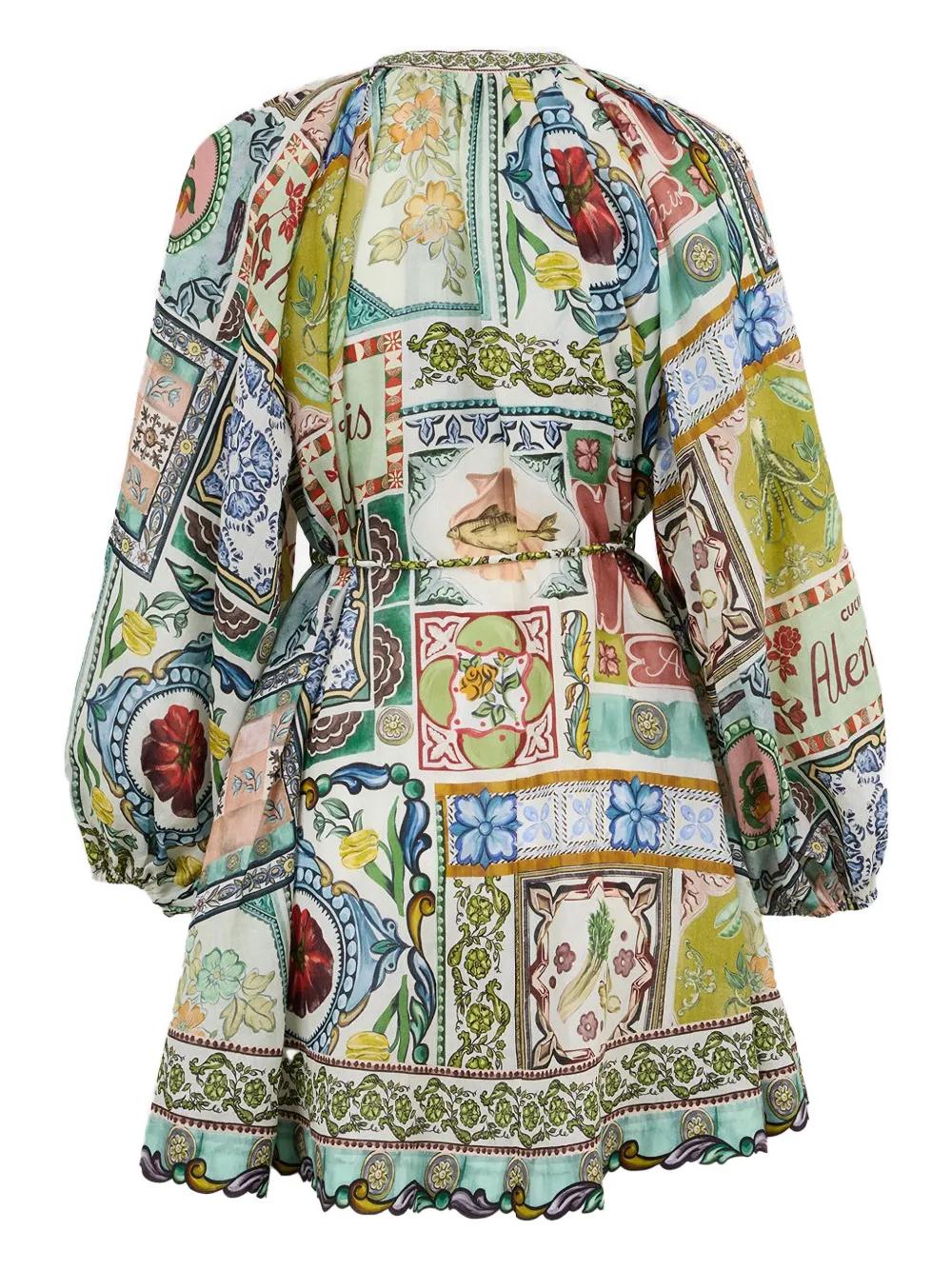 green and multicolour all-over print self-tie fastening gathered neckline long sleeves balloon sleeves