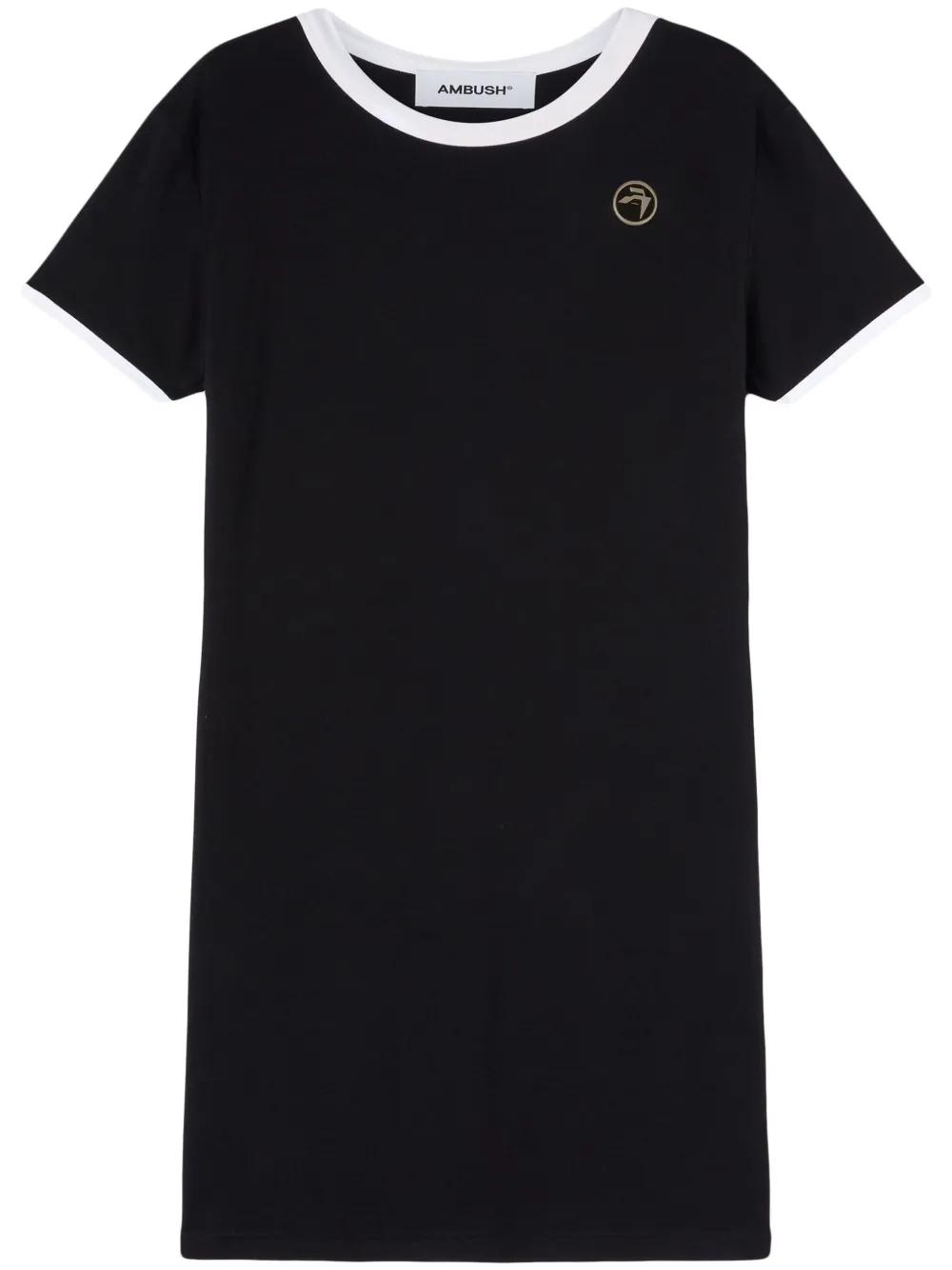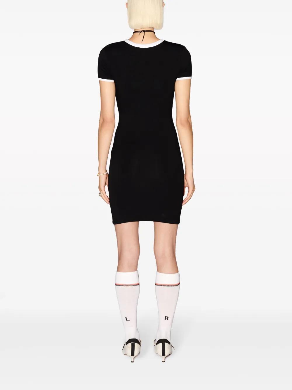 black/white ribbed knit appliqué logo contrasting trim crew neck short sleeves straight hem above-knee length
