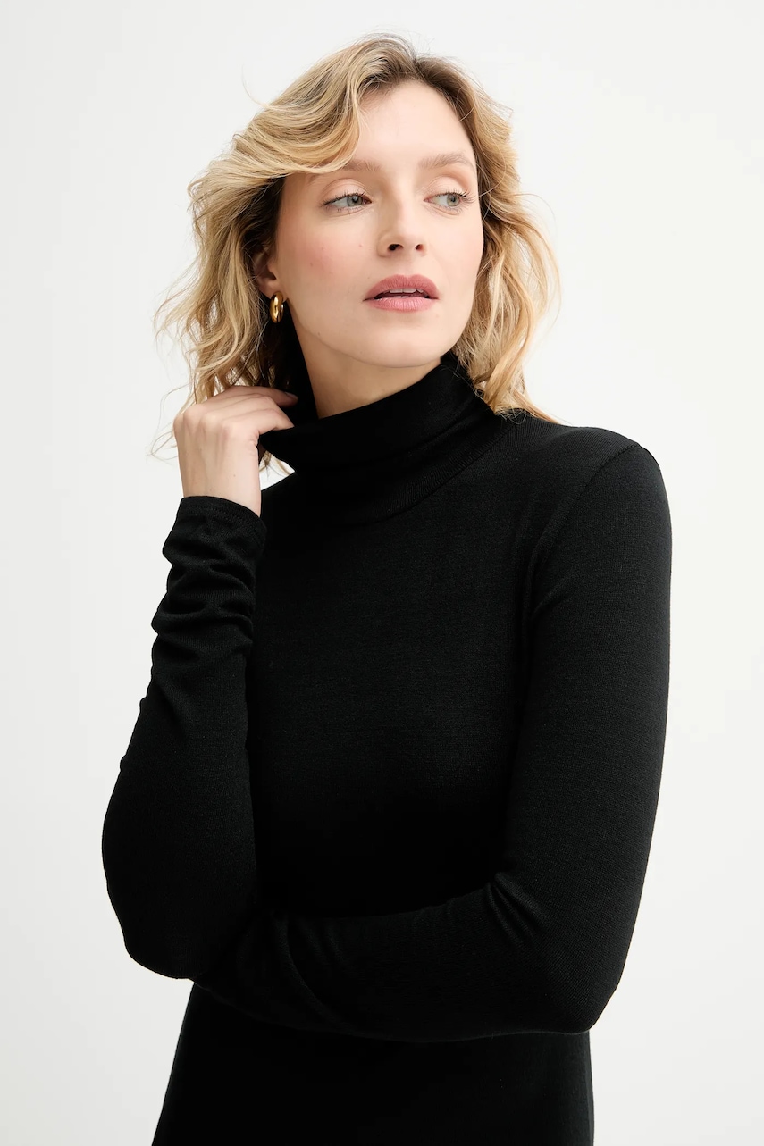 - Rozkloszowany fason. - Model z golfem. - Rękawy z ozdobnymi marszczeniami. - Długość rękawa: 61 cm. - Długość: 90 cm. - Szerokość pod pachami: 40 cm. - Wymiary podane dla rozmiaru: S.