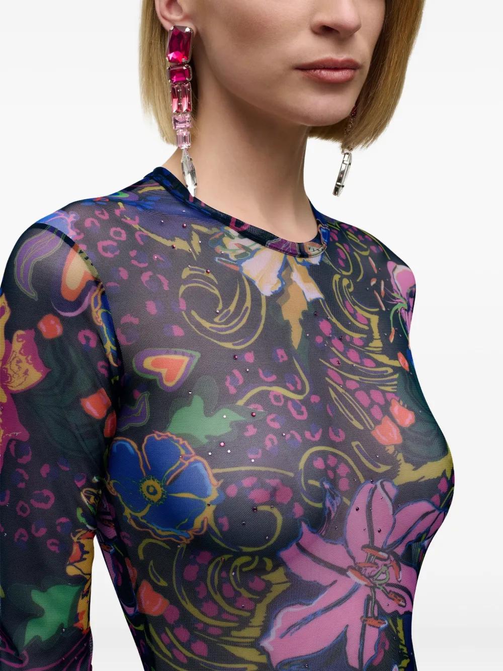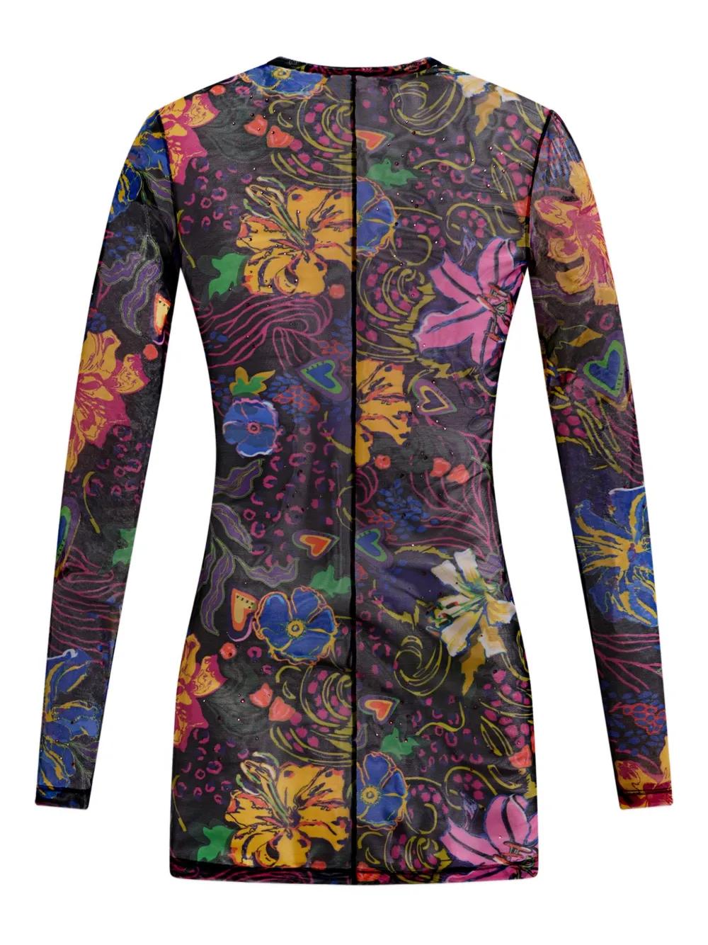 black multicoloured floral print long sleeves tulle hotfix embellishment round neck