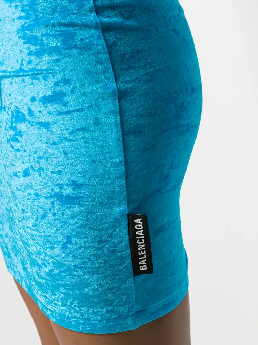 The Spanish fashion house of Balenciaga offers cutting edge styles that balance clean, modern silhouettes with strong shapes and innovation with refinement, as seen on this light blue draped mini dress. Featuring a stand up collar, a fitted silhouette, one long sleeve and a tie-knot detail at the waist.