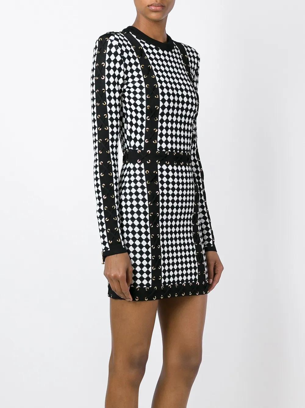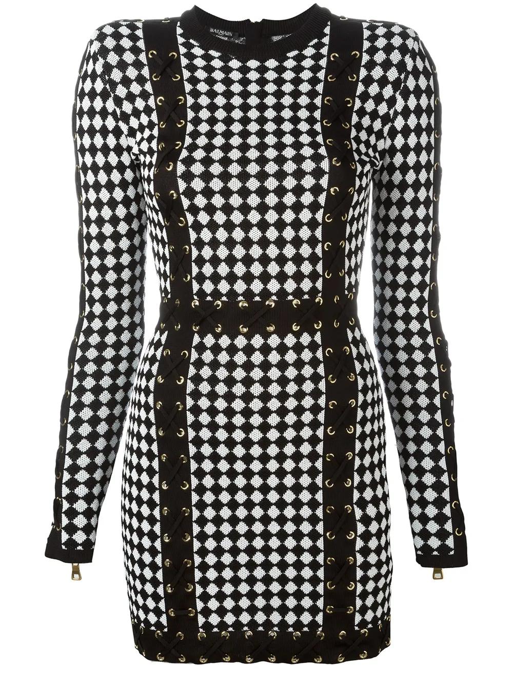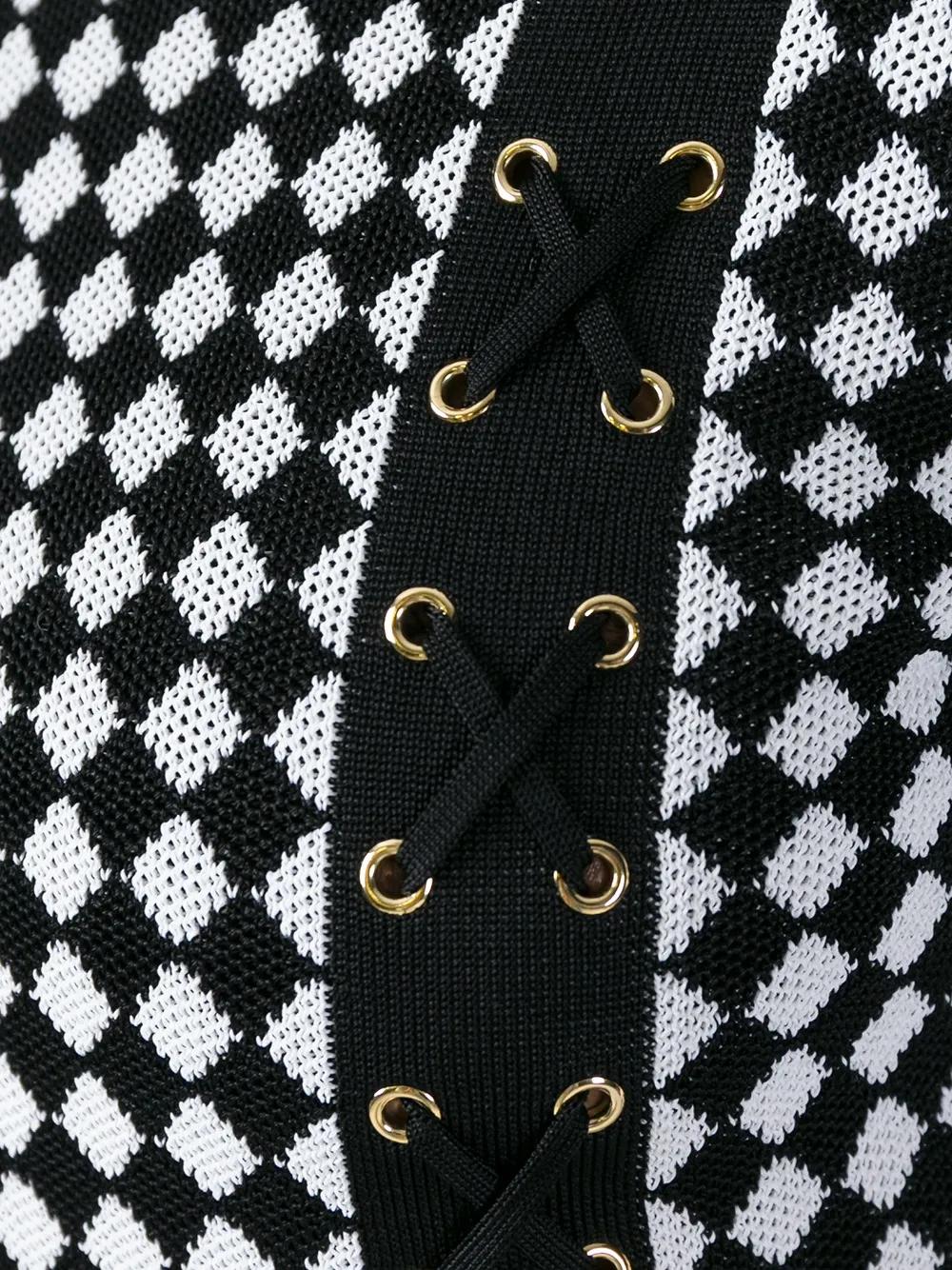 Black and white checked knit dress from Balmain featuring a ribbed round neck, long sleeves, a rear zip fastening, a lace up detail, a fitted silhouette and a short length.