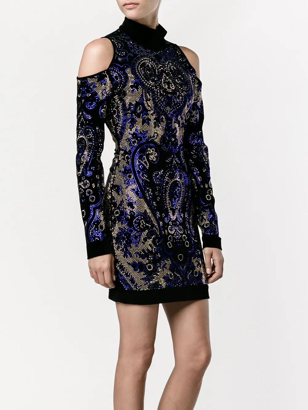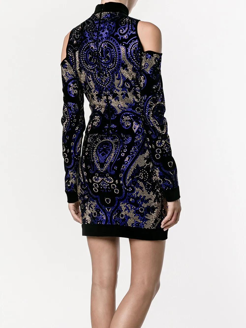 Black and blue stretch cotton cold-shoulder mini dress from Balmain featuring a ribbed stand up collar, a gold-tone stud detailing, a cut out detail, a fitted silhouette and a short length.