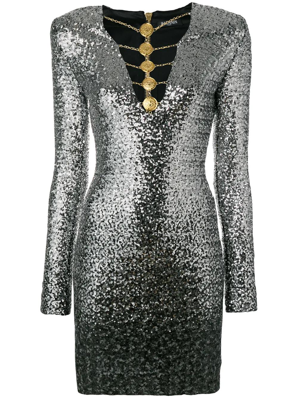 Olivier Rousteing continues his evolution of Balmain’s classic styles into the brand’s Spring/Summer ‘18 collection and beyond. Equal amounts decorative, daring and refined, these garments are an elevation of Parisian craftsmanship. Crafted from a silk blend, this striking sequined dress features a v-neck with gold-tone embossed discs, long sleeves, a rear zip fastening and a straight hem.