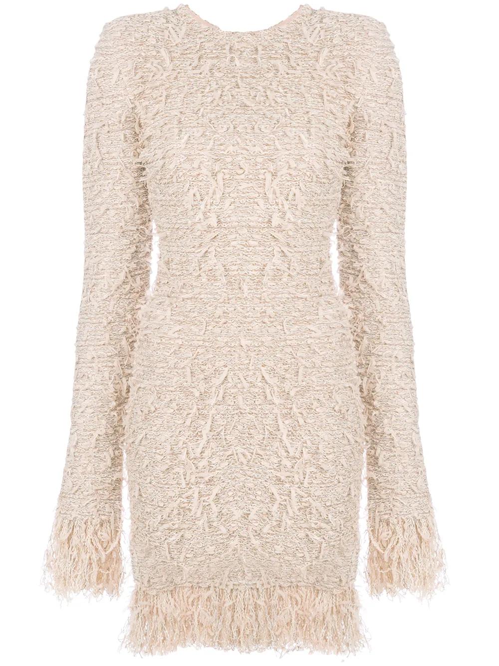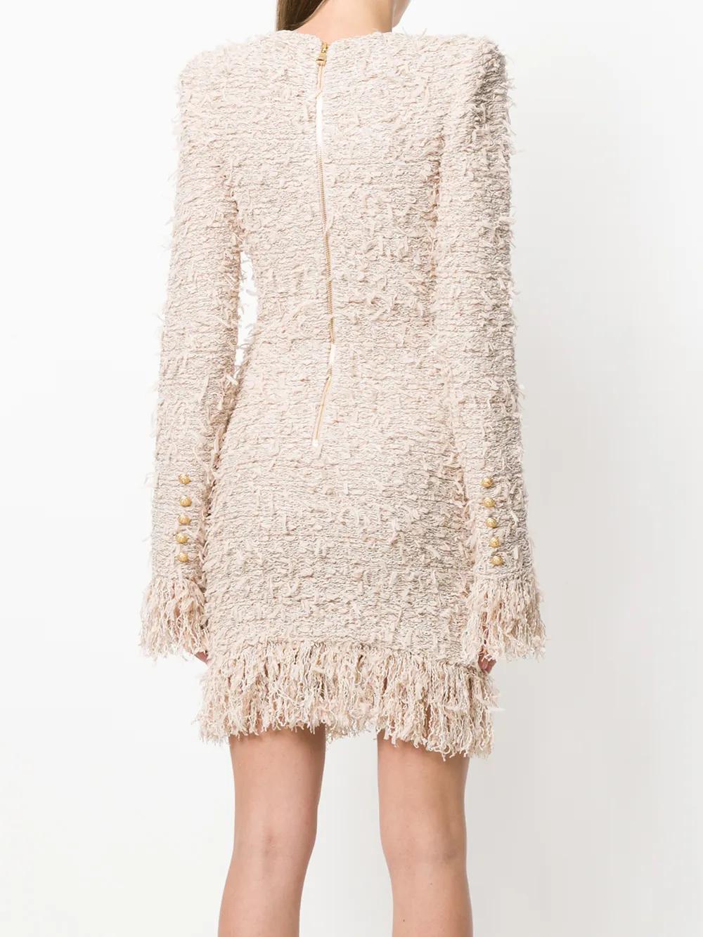 Despite his innovative evolution of the brand, Olivier Rousteing does not shy away from Balmain's unmissable classics that truly define the fashion house. Crafted from nude pink cotton, this frayed fitted dress is the ideal way to infuse some luxury into your life. Stylish yet comfortable, it features a round neck, structured shoulders, long sleeves, frayed edges and a short length.