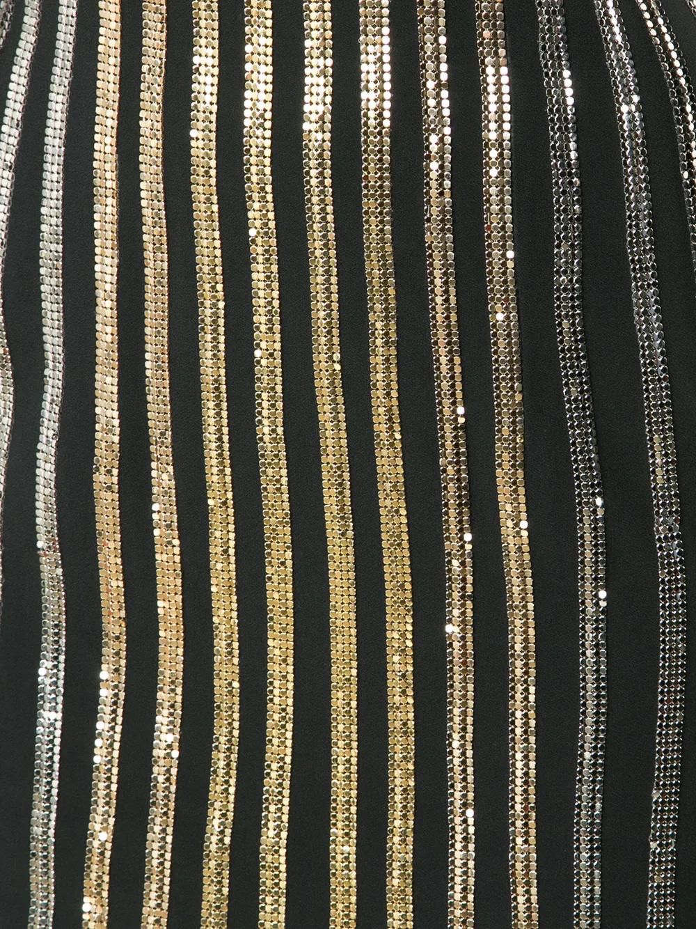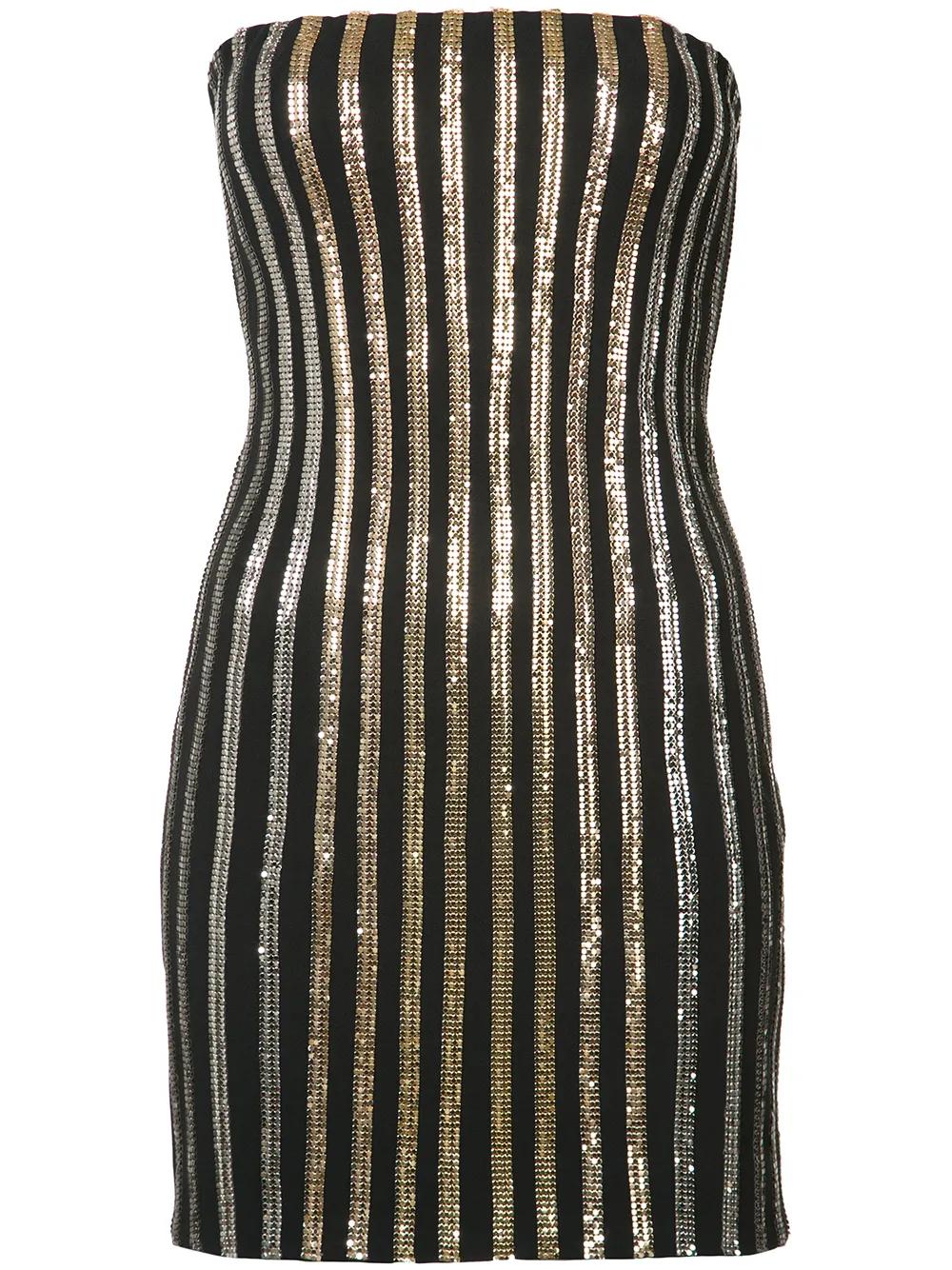 Black and gold-tone glitter stripe strapless dress from Balmain featuring a slim fit, a rear zip fastening, gold-tone hardware and a short length. This item fits small, please select the next size up.
