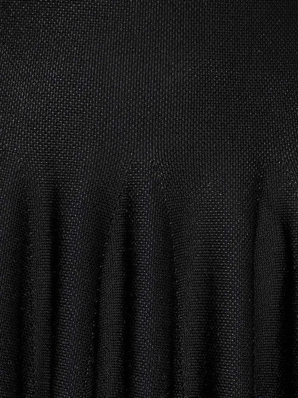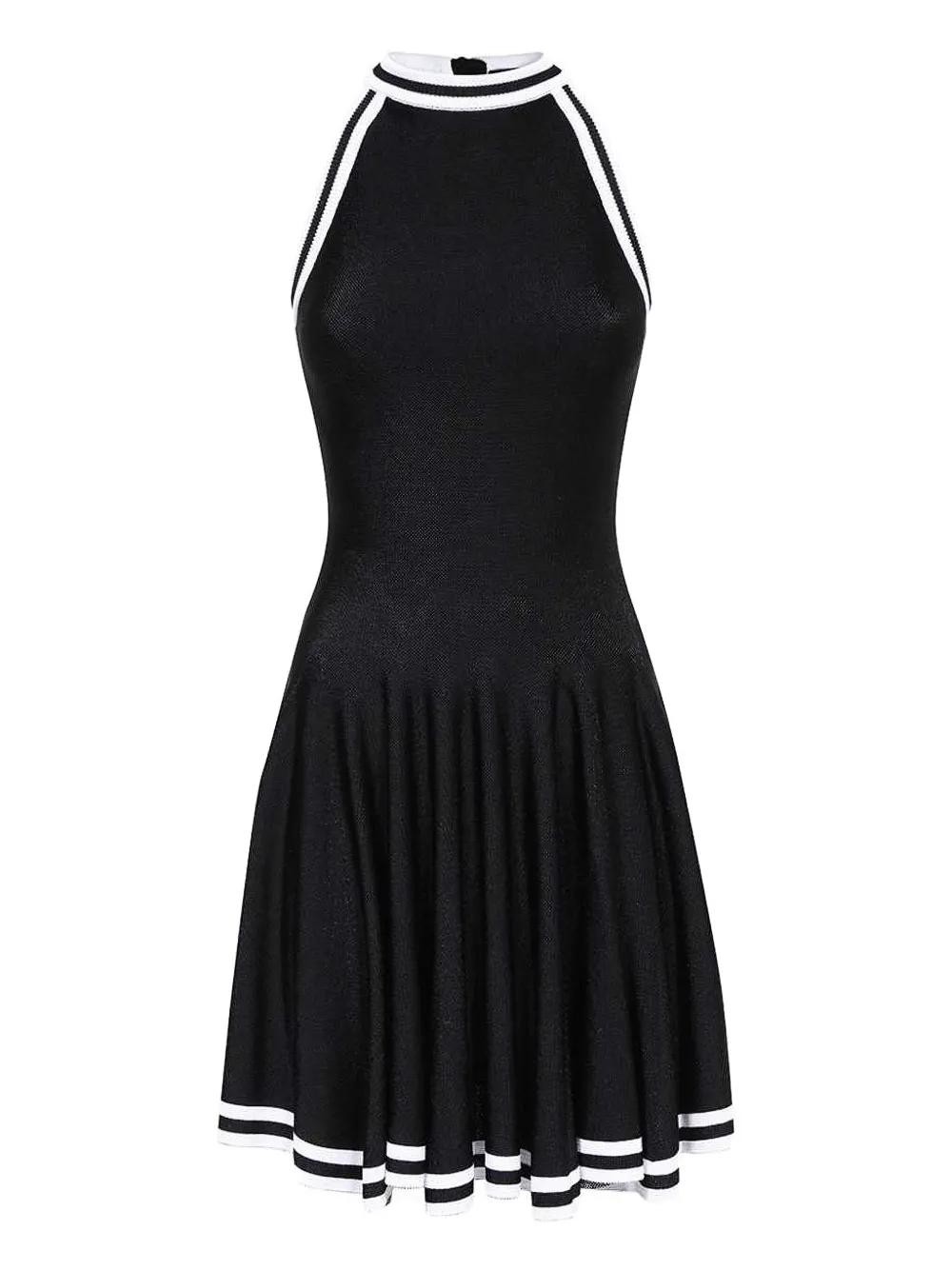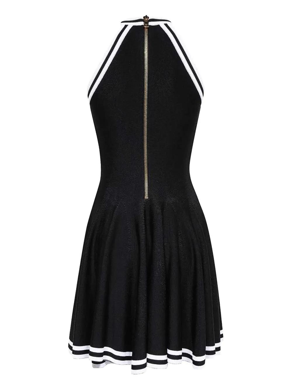 black halterneck fluted skirt flared hem sleeveless striped trim zip fastening