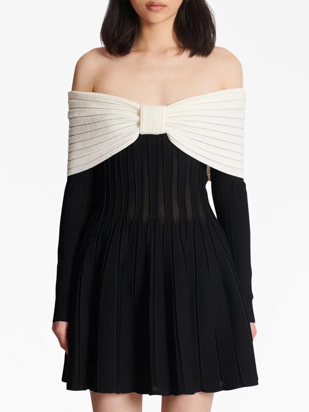 black/white knitted construction textured finish off-shoulder rear zip fastening long sleeves pleated skirt thigh-length straight hem