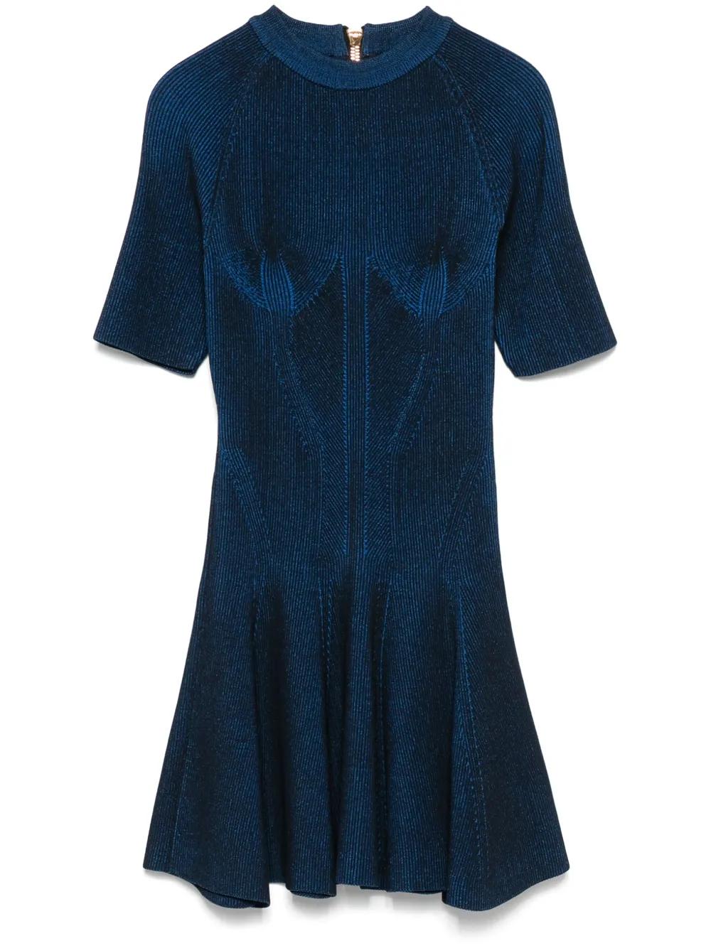 This elegant short-sleeve ribbed knit dress by Balmain is crafted in a electric blue shade. Featuring a fitted silhouette, it flares gently at the hem for a flattering look. The back showcases a bold gold-tone zip detail, adding a modern edge to the design. A versatile and stylish choice for both daytime and evening wear. Made in Italy Color: Electric BlueCare instructions: Machine wash on a cold gentle cycle