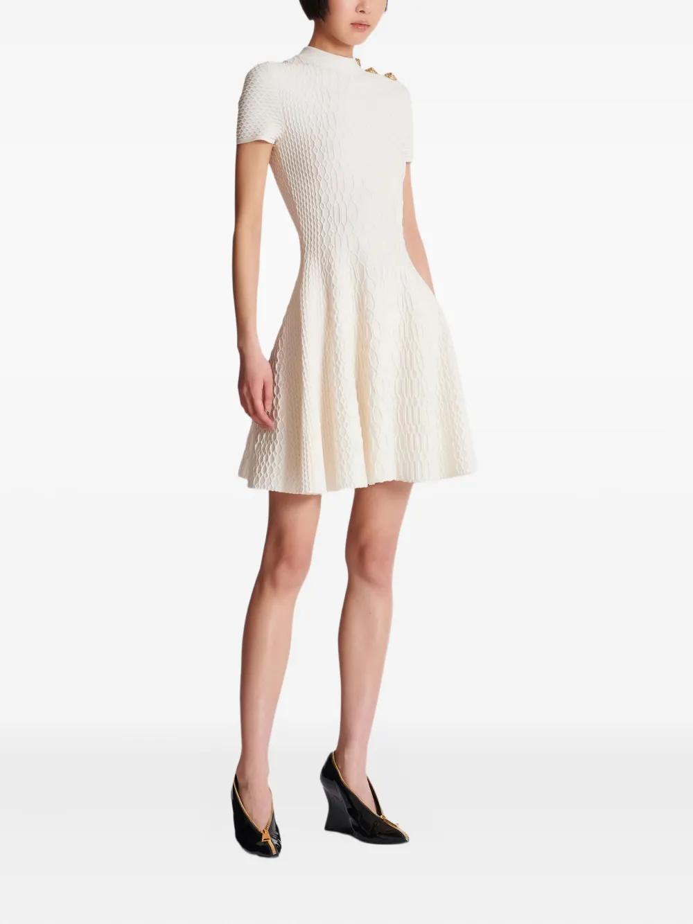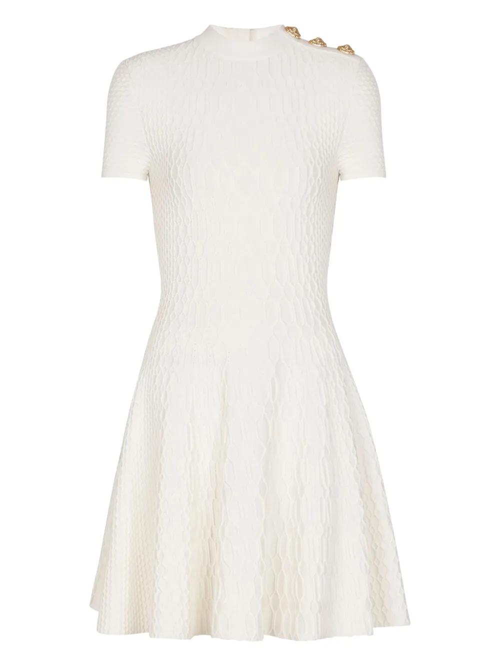 off-white textured knit flared hem short sleeves mock neck gold buttons