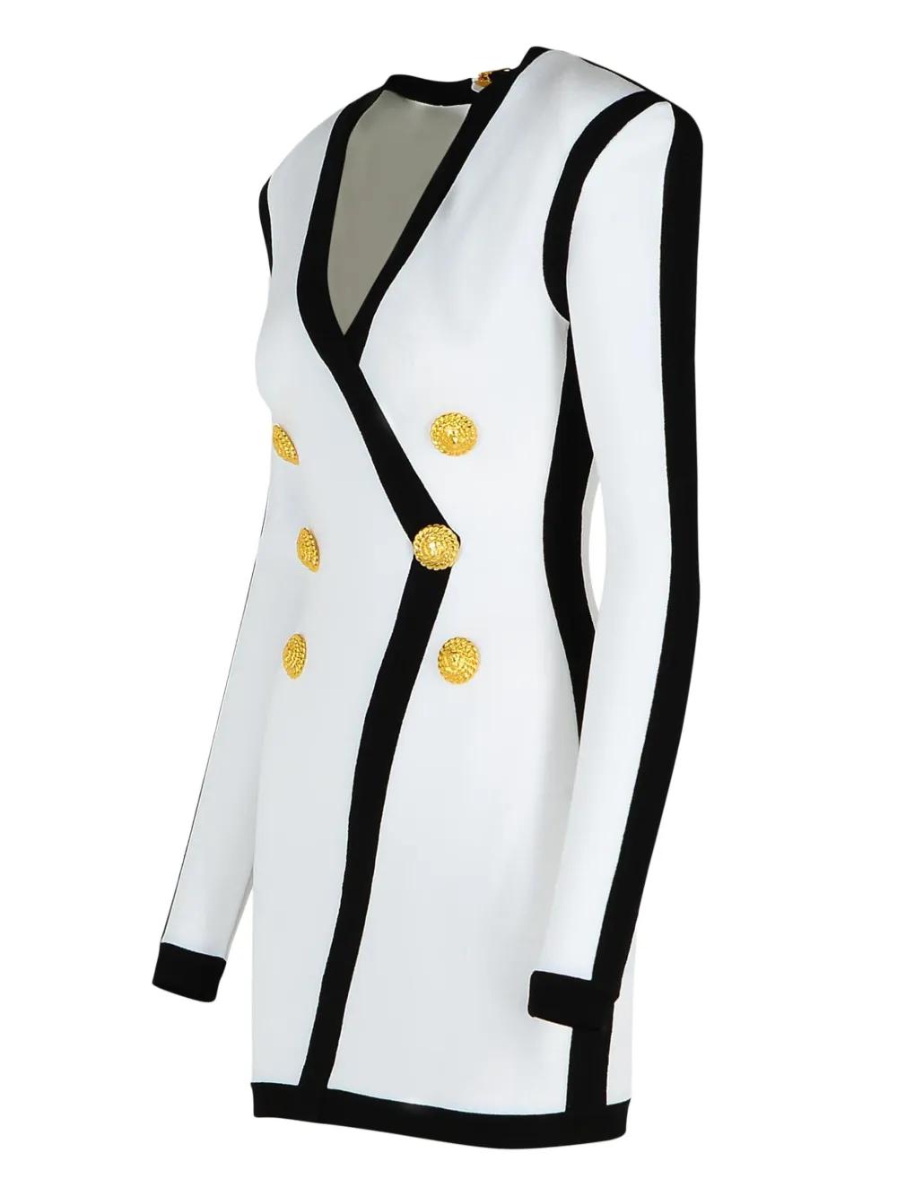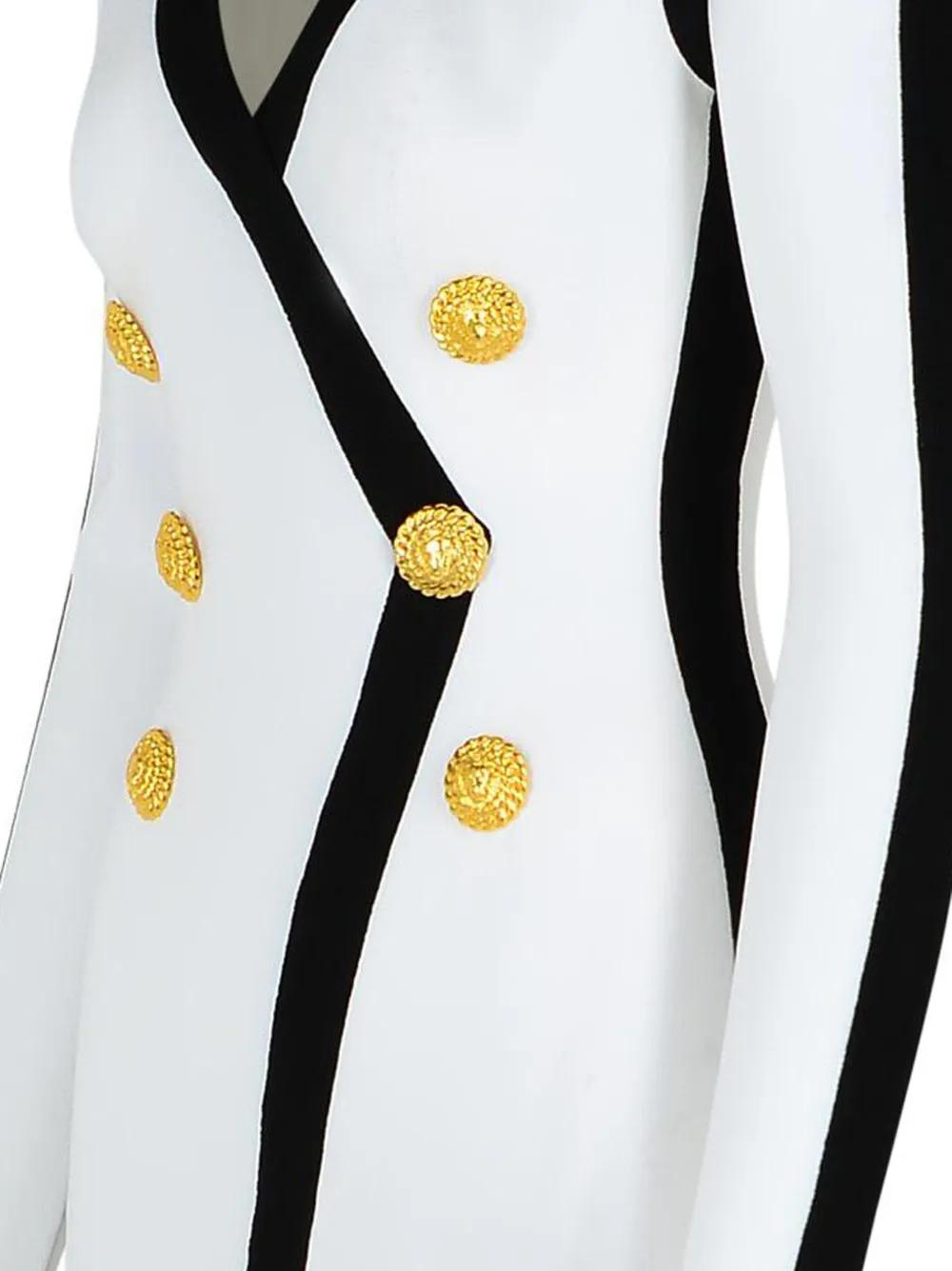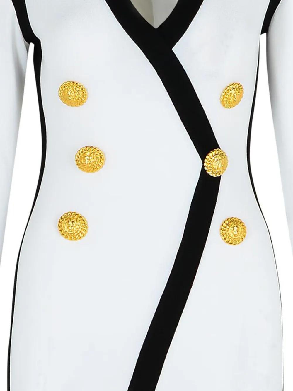 white black contrast trim V-neck long sleeves gold-tone buttons