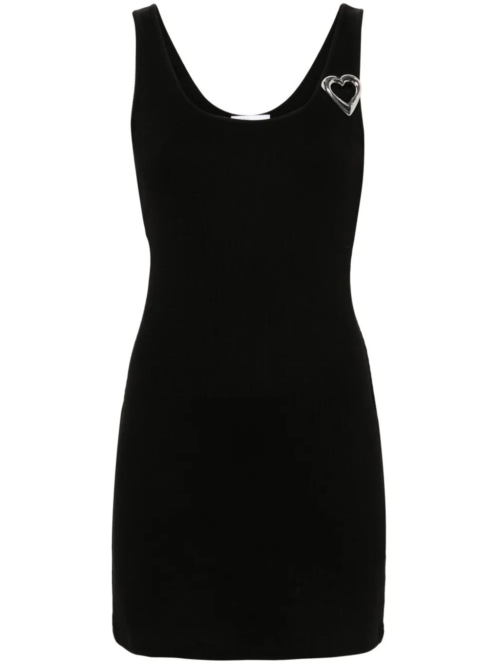 black cotton blend fine ribbed brooch detail rhinestone logo embellishment scoop neck sleeveless straight hem thigh-length unlined