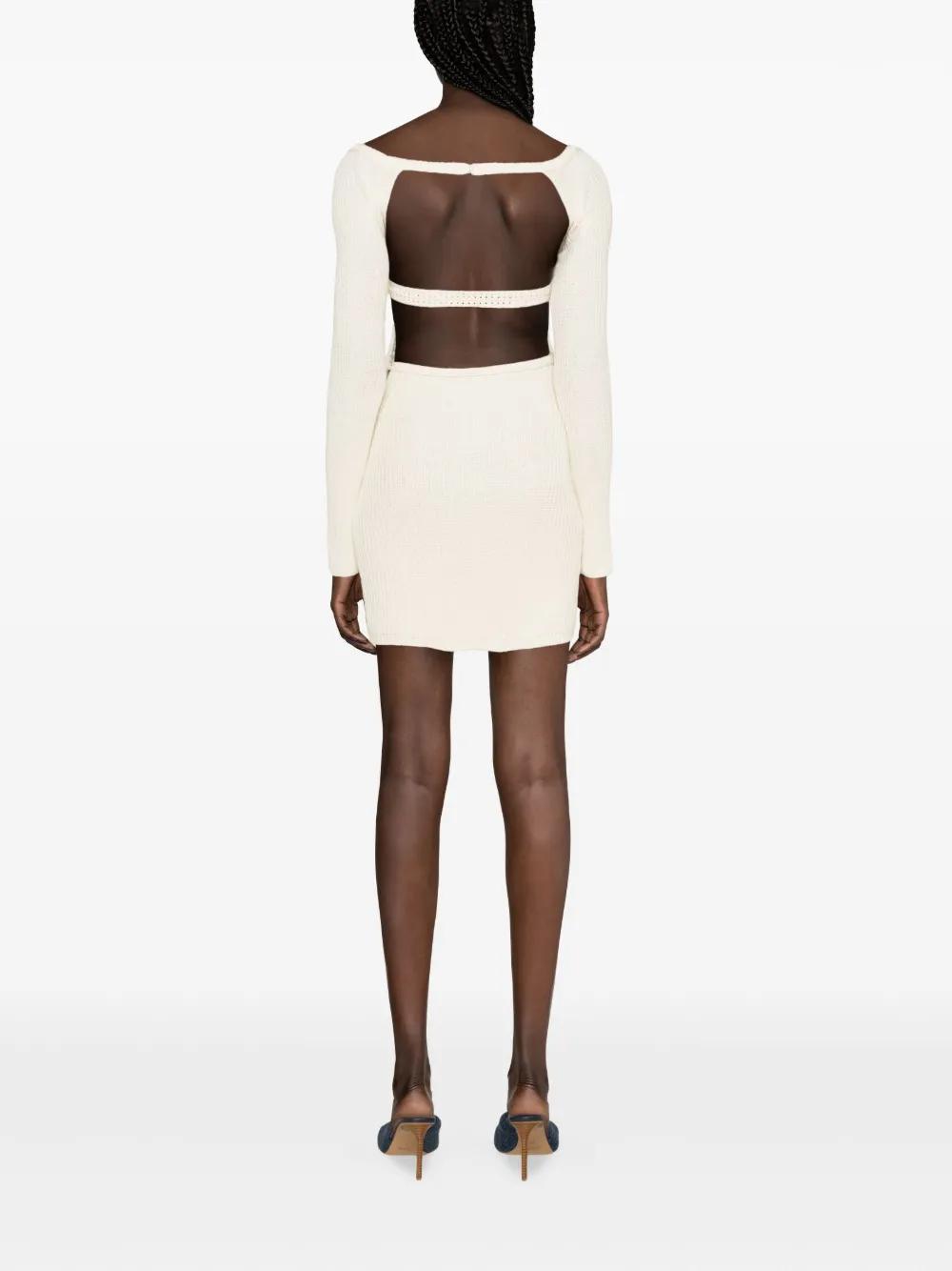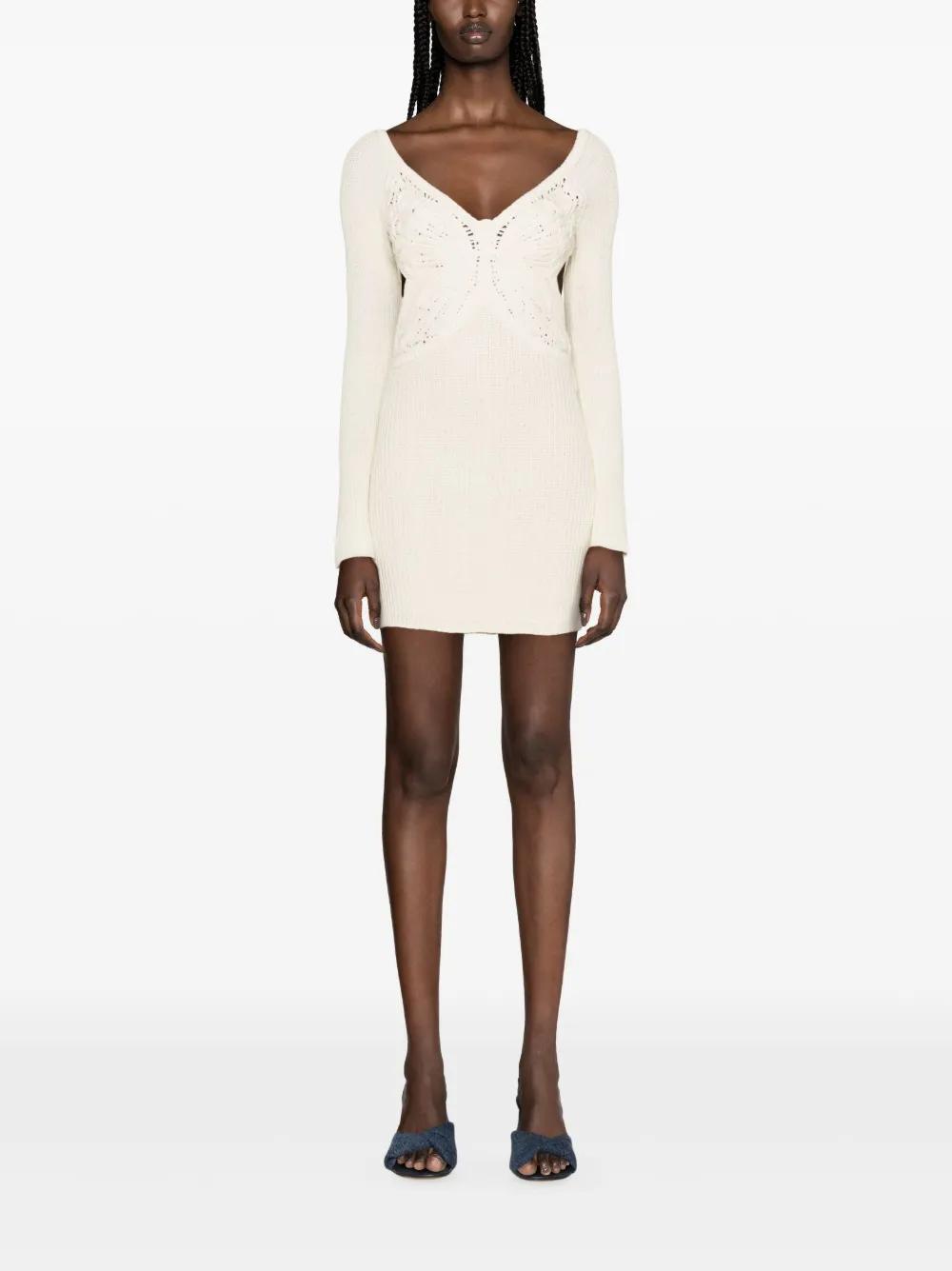 white cotton blend ribbed knit butterfly embroidered design sweetheart neck rear button fastening open back long sleeves straight hem mid-length
