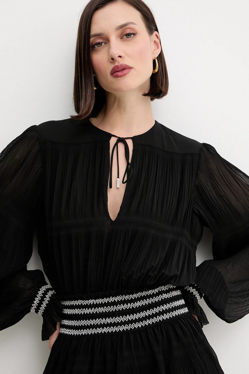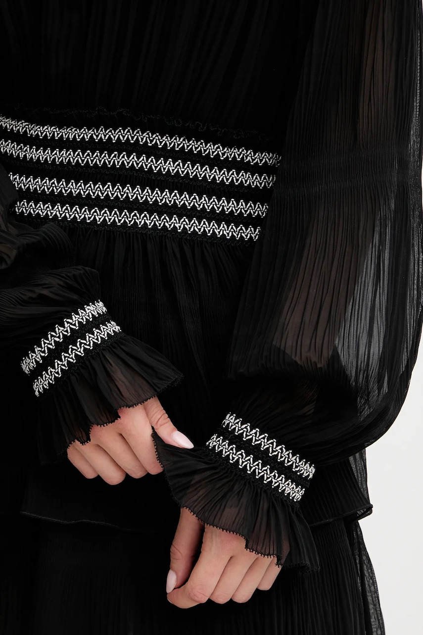 - Rozkloszowany fason. - Dodatkowa warstwa materiału w postaci podszewki. - Spiczasty dekolt. - Wiązany dekolt. - Model z ozdobnymi falbanami. - Długość rękawa: 70 cm - Długość: 88 cm. - Szerokość pod pachami: 50 cm. - Wymiary podane dla rozmiaru: 36.