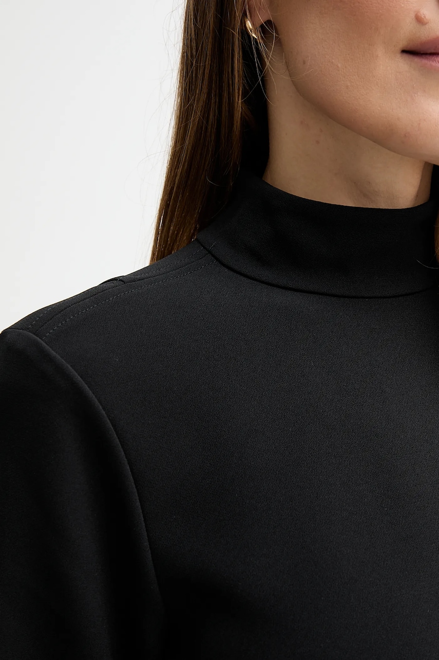 - Prosty fason. - Model o długości mini. - Model z półgolfem. - Długie rękawy. - Zapięcie na kryty suwak i haftkę. - Długość rękawa: 59 cm. - Długość: 86 cm. - Szerokość pod pachami: 42 cm. - Wymiary podane dla rozmiaru: XXS.